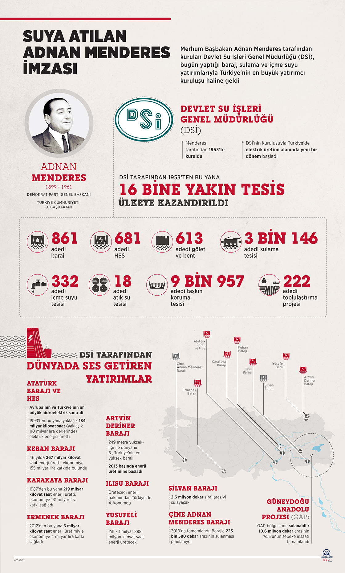 Merhum Başbakan Adnan Menderes tarafından kurulan Devlet Su İşleri (DSİ) Genel Müdürlüğü, bugün yaptığı baraj, sulama ve içme suyu yatırımlarıyla Türkiye'nin en büyük yatırımcı kuruluşu haline geldi.