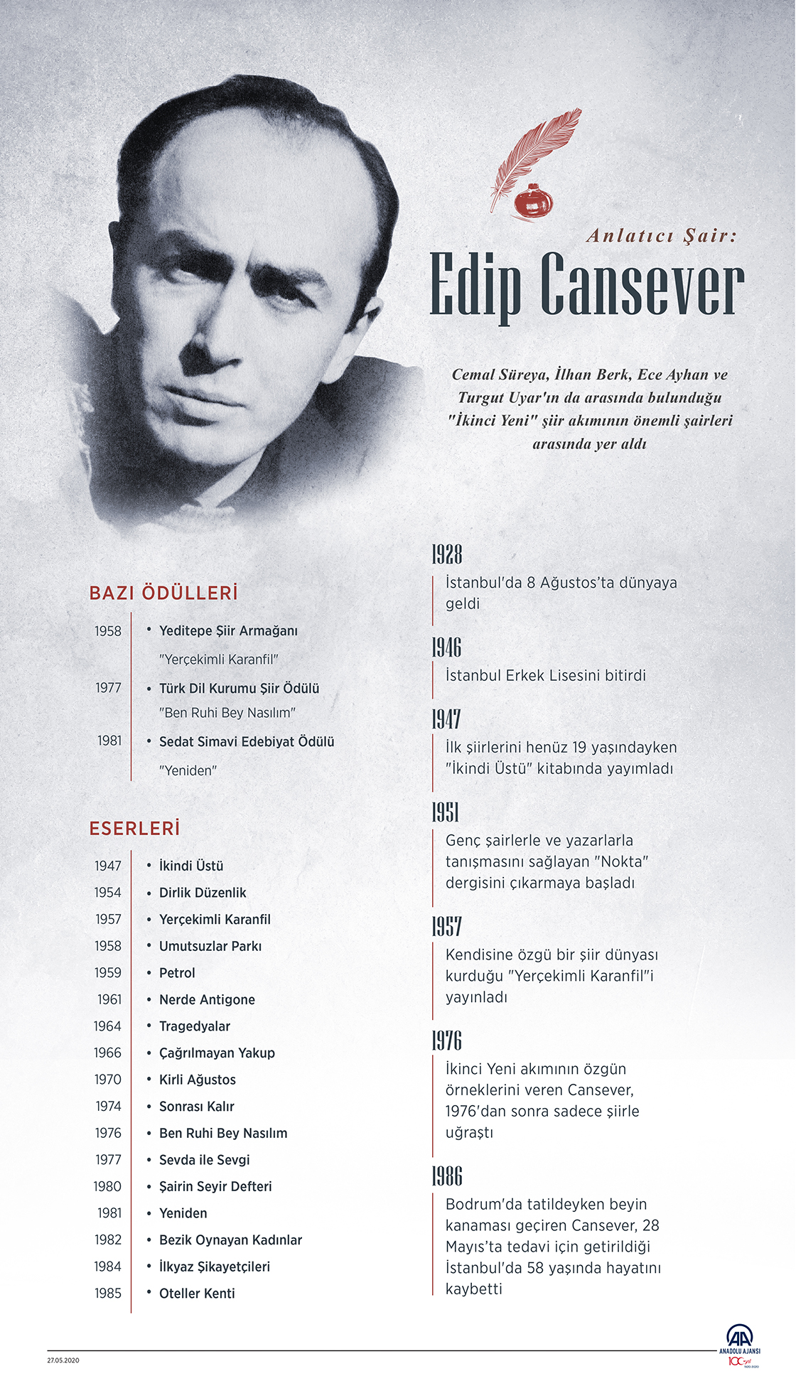 Cemal Süreya, İlhan Berk, Ece Ayhan ve Turgut Uyar'ın da bulunduğu "İkinci Yeni" şiir akımının önemli şairlerinden Edip Cansever, ölümünün 34. yılında yad ediliyor.