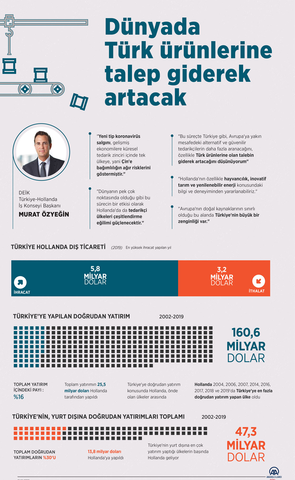 Dış Ekonomik İlişkiler Kurulu (DEİK) Türkiye-Hollanda İş Konseyi Başkanı ve FİBA Grubu Yönetim Kurulu Başkanı Murat Özyeğin, yeni tip koronavirüs (Kovid-19) salgınının, gelişmiş ekonomilere küresel tedarik zinciri içinde tek ülkeye, yani Çin'e bağımlılığın ağır risklerini gösterdiğini belirterek, "Dünyanın pek çok noktasında olduğu gibi bu sürecin bir etkisi olarak Hollanda'da da tedarikçi ülkeleri çeşitlendirme eğilimi güçlenecektir. Bu süreçte Türkiye gibi Avrupa'ya yakın mesafedeki alternatif ve güvenilir tedarikçilerin daha fazla aranacağını, özellikle Türk ürünlerine olan talebin giderek artacağını düşünüyorum." dedi. ( Mahmut Resul Karaca - Anadolu Ajansı )01 Haziran 2020•Güncelleme: 01 Haziran 2020
