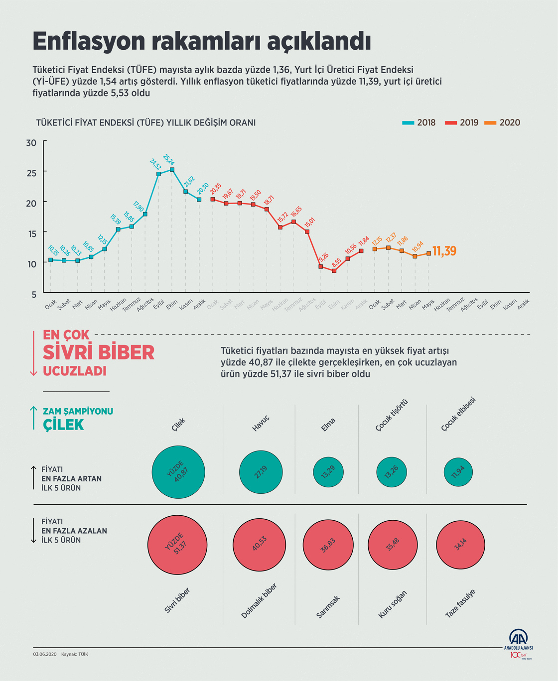 Türkiye İstatistik Kurumu (TÜİK) verilerine göre, mayıs ayı itibarıyla 12 aylık ortalamalar dikkate alındığında, tüketici fiyatları yüzde 12,1, yurt içi üretici fiyatları yüzde 9,14 arttı. Tüketici Fiyat Endeksi (TÜFE) mayısta aylık bazda yüzde 1,36, Yurt İçi Üretici Fiyat Endeksi (Yİ-ÜFE) yüzde 1,54 artış gösterdi. Yıllık enflasyon tüketici fiyatlarında yüzde 11,39, yurt içi üretici fiyatlarında yüzde 5,53 oldu. Geçen ay en fazla fiyat düşüşü ise yüzde 51,37 ile sivri biberde gerçekleşti. Bunu yüzde 40,53 ile dolmalık biber, yüzde 36,83 ile sarımsak, yüzde 35,48 ile kuru soğan, yüzde 34,14 ile taze fasulye, yüzde 22,54 ile patates, yüzde 14,98 ile salatalık, yüzde 9,81 ile parfüm izledi. ( Ahmet Burak Özkan - Anadolu Ajansı )03 Haziran 2020•Güncelleme: 03 Haziran 2020