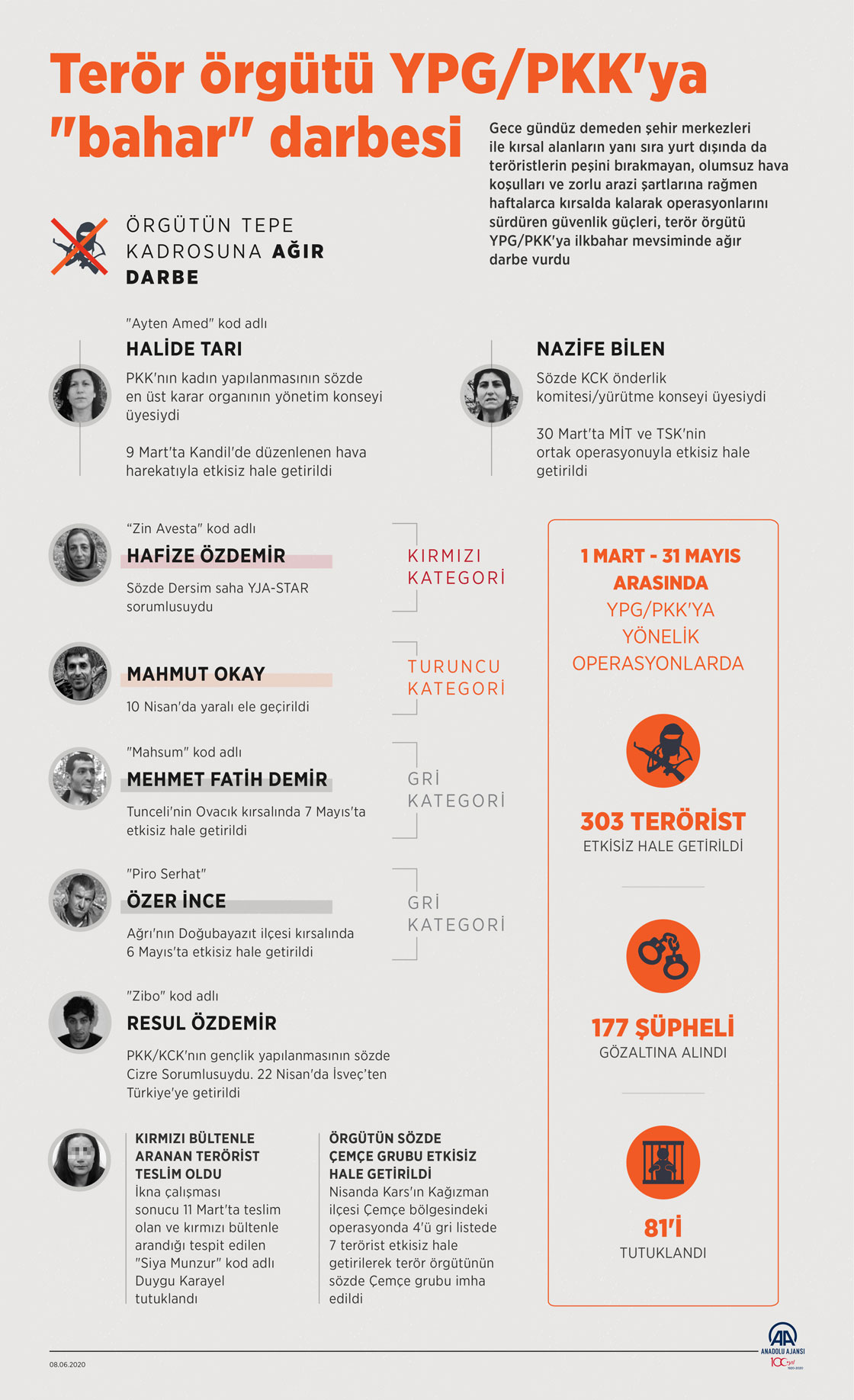 Türkiye'nin barış, huzur ve güvenliğini bozmak için bebek ve çocukları dahi hedef almaktan çekinmeyen terör örgütü YPG/PKK'ya yönelik bu yılın mart, nisan ve mayıs ayında düzenlenen başarılı operasyonlarda, aralarında örgütün sözde sorumlularının da bulunduğu 303 terörist etkisiz hale getirildi. ( Yasin Demirci - Anadolu Ajansı )08 Haziran 2020•Güncelleme: 08 Haziran 2020
