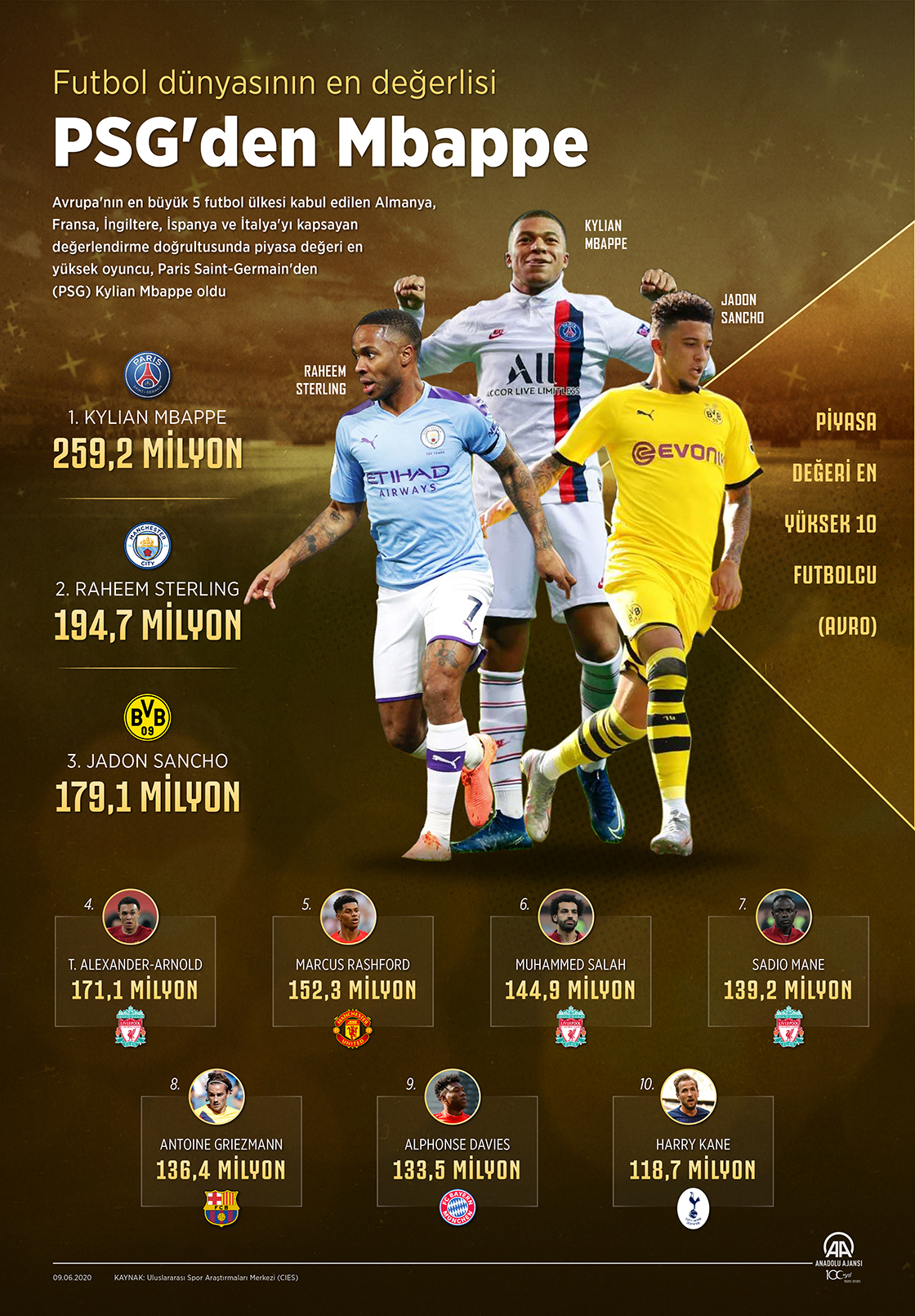 Avrupa'nın en büyük 5 futbol ülkesi kabul edilen Almanya, Fransa, İngiltere, İspanya ve İtalya'yı kapsayan değerlendirme doğrultusunda piyasa değeri en yüksek oyuncu, Paris Saint-Germain'den (PSG) Kylian Mbappe oldu. ( Muhammed Ali Yiğit - Anadolu Ajansı )09 Haziran 2020•Güncelleme: 09 Haziran 2020