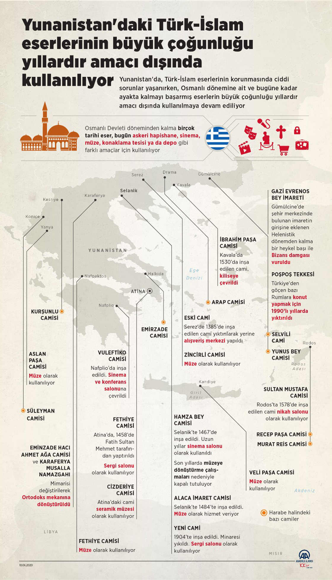 Yunanistan'da, Türk-İslam eserlerinin korunmasında ciddi sorunlar yaşanırken, Osmanlı dönemine ait ve bugüne kadar ayakta kalmayı başarmış eserlerin büyük çoğunluğu yıllardır amacı dışında kullanılmaya devam ediliyor. (Anadolu Ajansı - Elmurod Usubaliev)10 Haziran 2020•Güncelleme: 11 Haziran 2020