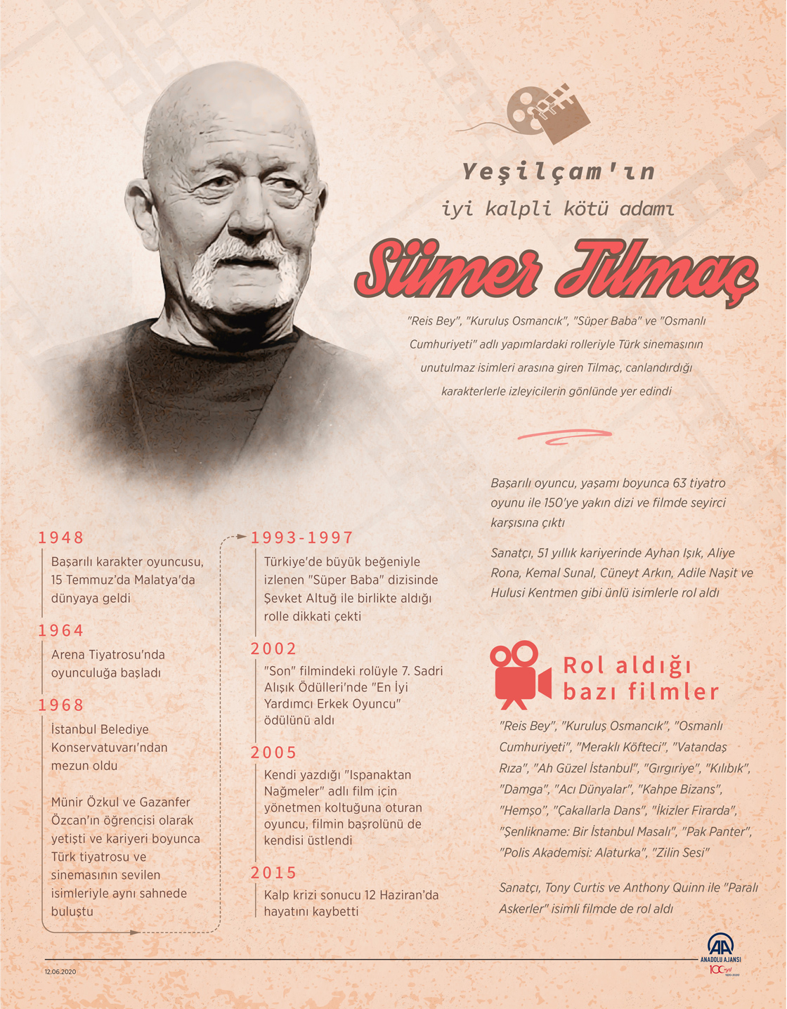 Reis Bey", "Kuruluş Osmancık", "Süper Baba" ve "Osmanlı Cumhuriyeti" adlı yapımlardaki rolleriyle Türk sinemasının unutulmaz isimleri arasına giren Sümer Tilmaç, canlandırdığı karakterlerle izleyicilerin gönlünde yer edindi. (Grafik: Muhammed Ali Yiğit/AA)