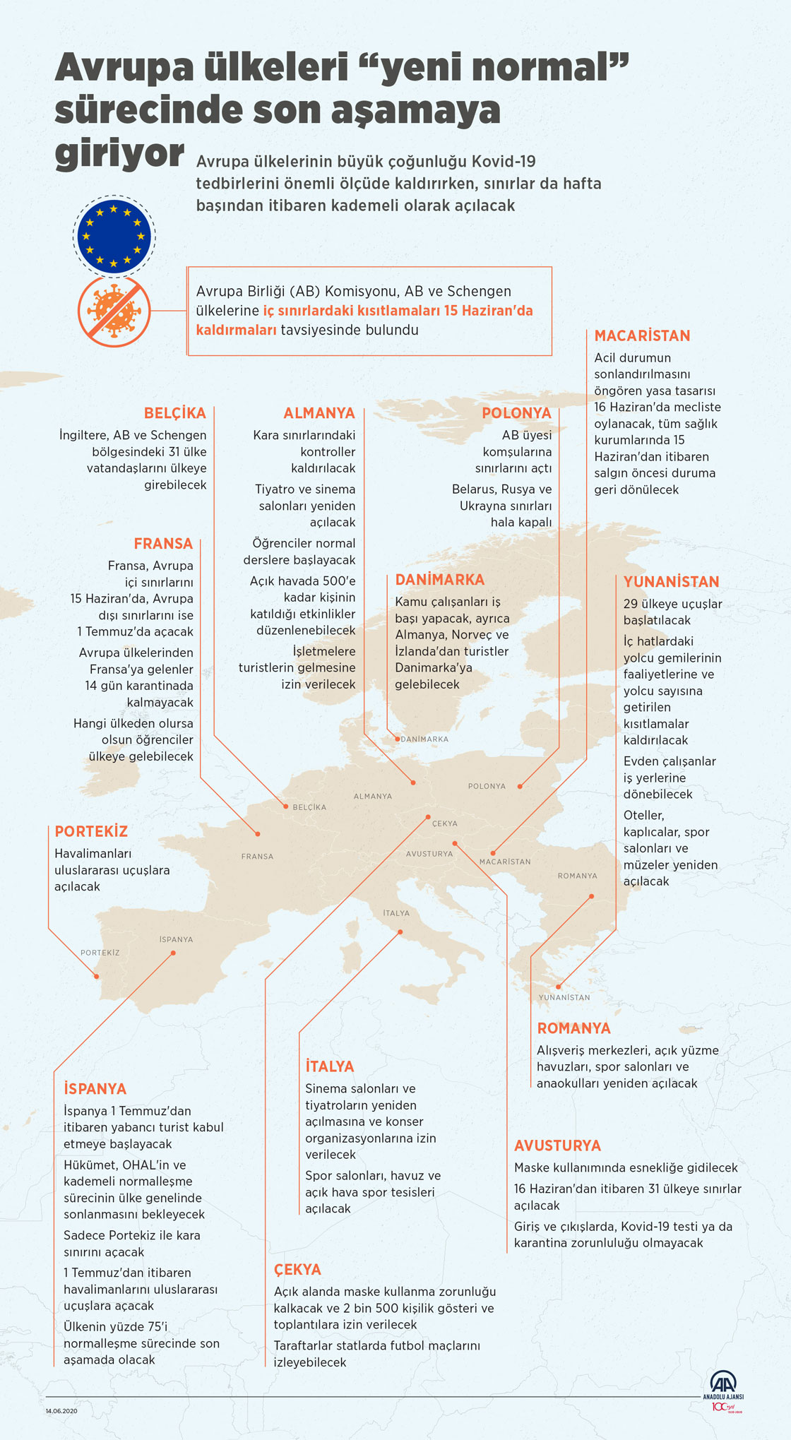 Avrupa ülkeleri yeni tip koronavirüs (Kovid-19) salgınıyla mücadele kapsamında aldıkları tedbirleri kaldırmayı sürdürürken "yeni normal" olarak adlandırılan süreçte yarından itibaren büyük ölçüde son aşamaya girilecek. ( Elmurod Usubaliev - Anadolu Ajansı )14 Haziran 2020•Güncelleme: 14 Haziran 2020