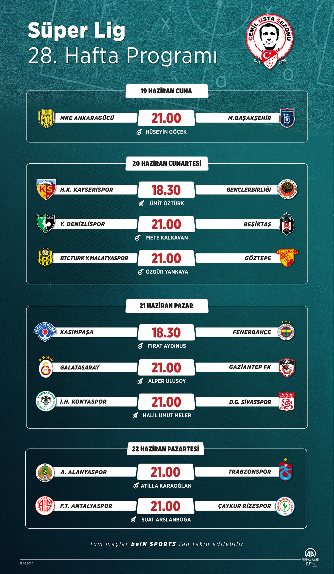 Süper Lig'in 28. haftasında ilk maç 19 Haziran Cuma günü MKE Ankaragücü ile Medipol Başakşehir arasında yapılacak. 20 Haziran Cumartesi ve 21 Haziran Pazar günü 3, 22 Haziran Pazartesi günü ise 2 maç oynanacak.(Grafik: Kemal Delikmen/AA)
