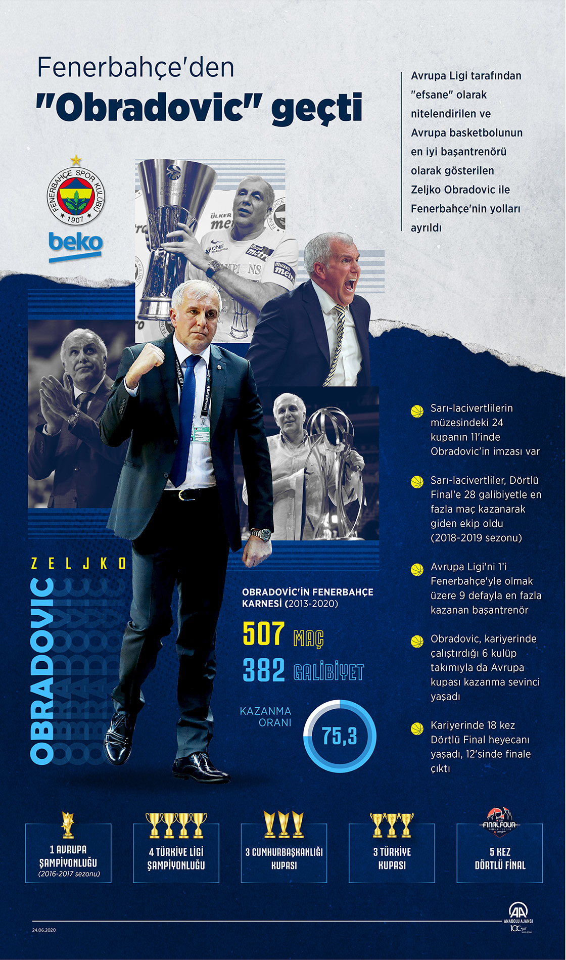 Avrupa Ligi tarafından "efsane" olarak nitelendirilen ve Avrupa basketbolunun en iyi başantrenörü olarak gösterilen Zeljko Obradovic ile Fenerbahçe'nin yolları ayrıldı. (Anadolu Ajansı - Muhammed Ali Yiğit)