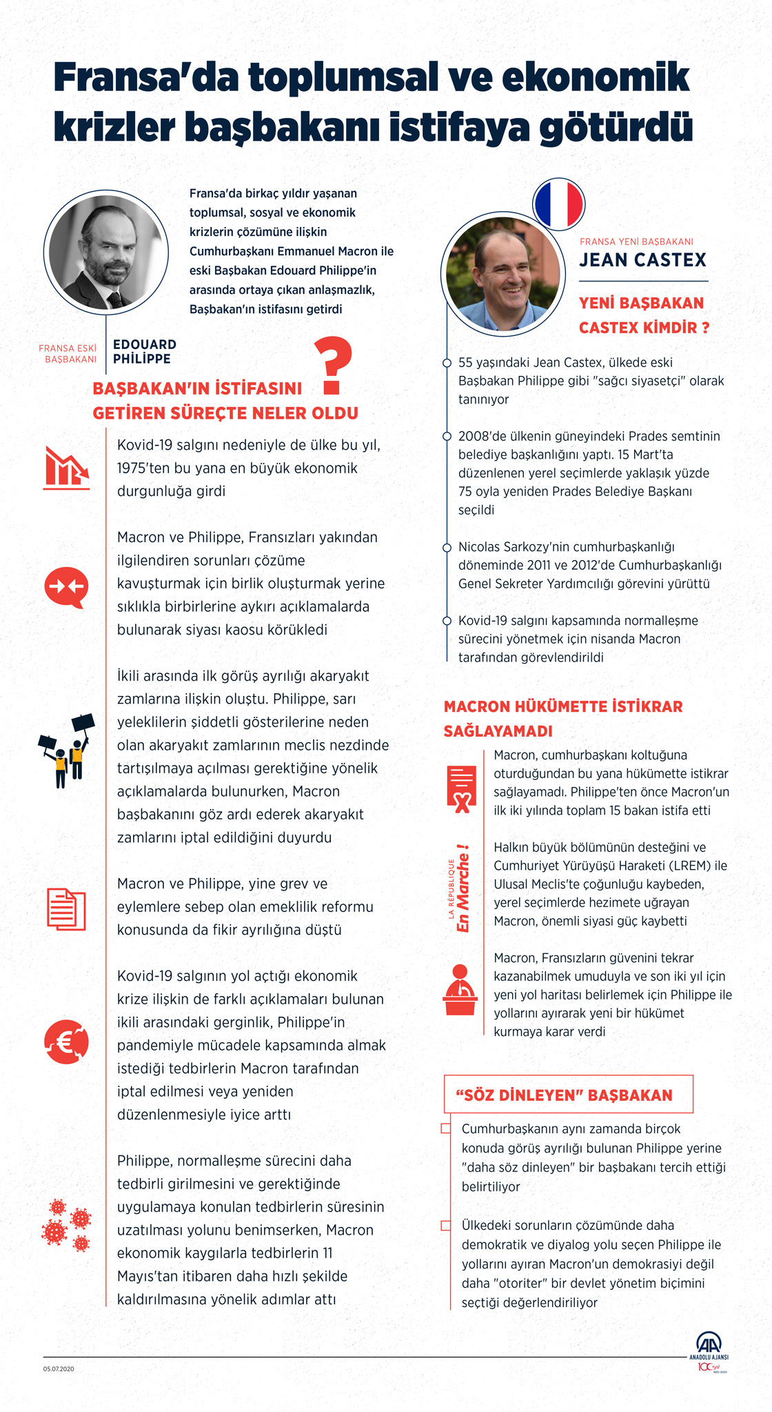 Fransa'da birkaç yıldır yaşanan toplumsal, sosyal ve ekonomik krizlerin çözümüne ilişkin Cumhurbaşkanı Emmanuel Macron ile eski Başbakan Edouard Philippe'in arasında ortaya çıkan anlaşmazlık, Başbakan'ın istifasını getirdi. ( Muhammed Ali Yiğit - Anadolu Ajansı )05 Temmuz 2020•Güncelleme: 05 Temmuz 2020