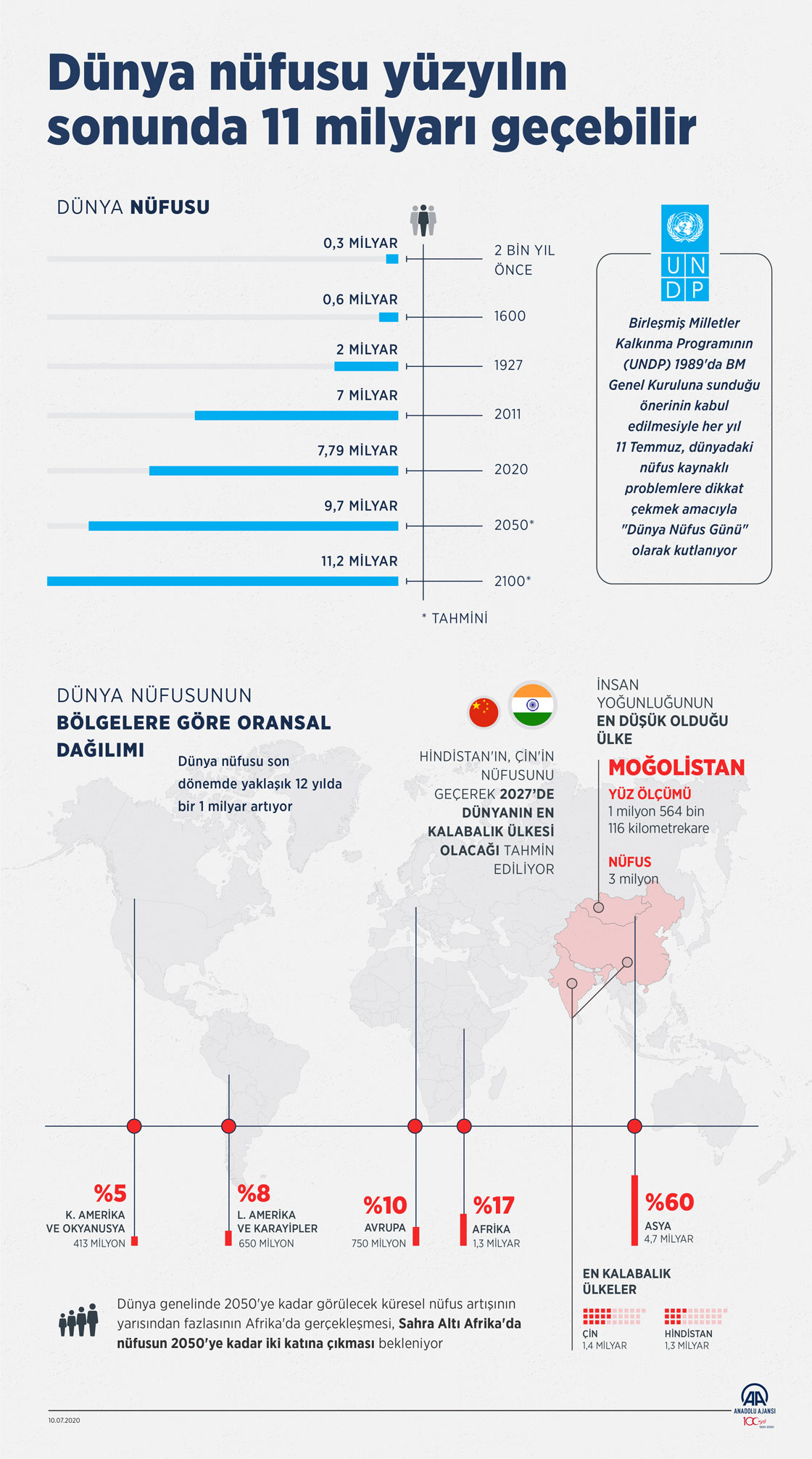 Halihazırda 7,79 milyar olan dünya nüfusunun, 2100 yılında 11,2 milyara yükseleceği tahmin ediliyor. Birleşmiş Milletler (BM) Kalkınma Programının (UNDP) 1989'da BM Genel Kuruluna sunduğu önerinin kabul edilmesiyle her yıl 11 Temmuz, dünyadaki nüfus kaynaklı problemlere dikkati çekmek amacıyla "Dünya Nüfus Günü" olarak kutlanıyor. ( Kemal Delikmen - Anadolu Ajansı )10 Temmuz 2020•Güncelleme: 10 Temmuz 2020