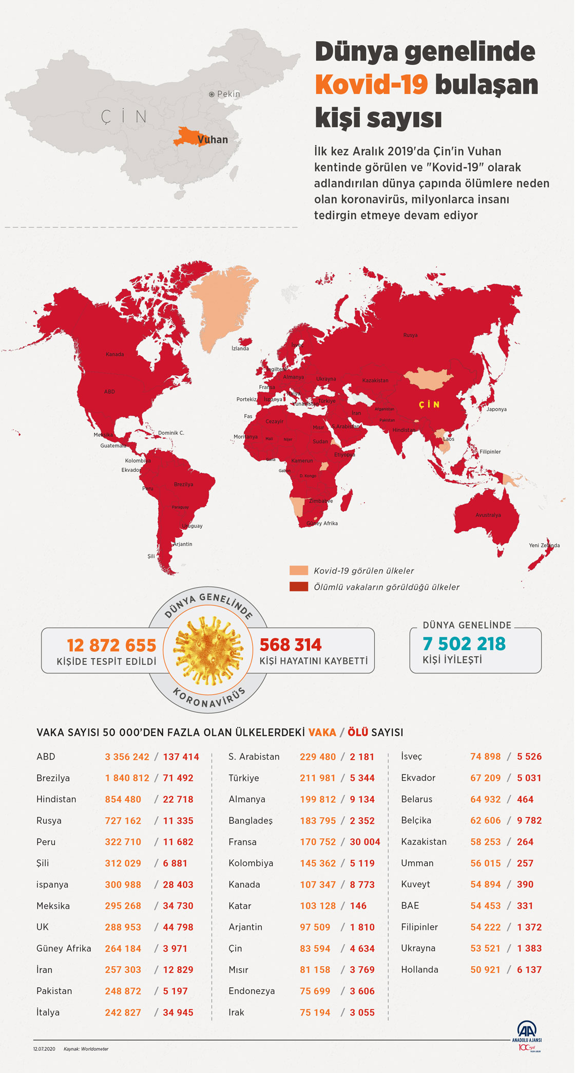 Çin'in Hubey eyaletine bağlı Vuhan kentinde ortaya çıkan ve dünyaya yayılan yeni tip koronavirüs (Kovid-19) tespit edilen kişi sayısı, dünya genelinde 12 milyon 856 bini geçti.