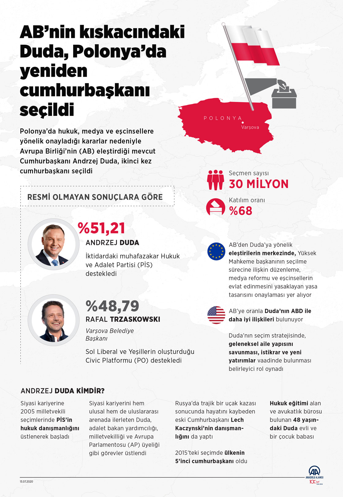 Polonya’da hukuk, medya ve eşcinsellere yönelik onayladığı kararlar nedeniyle Avrupa Birliği’nin (AB) eleştirdiği mevcut Cumhurbaşkanı Andrzej Duda, ikinci kez cumhurbaşkanı seçildi. ( Elmurod Usubaliev - Anadolu Ajansı )
