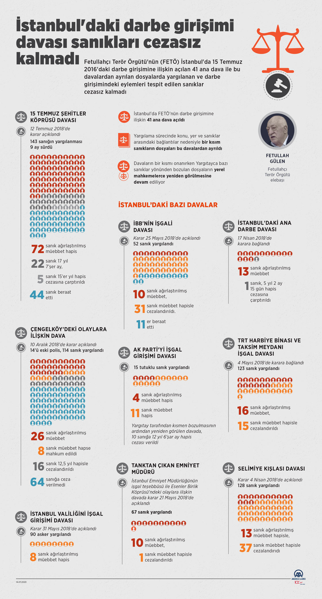Fetullahçı Terör Örgütü'nün (FETÖ) İstanbul'da 15 Temmuz 2016'daki darbe girişimine ilişkin açılan 41 ana dava ile bu davalardan ayrılan dosyalarda yargılanan ve darbe girişimindeki eylemleri tespit edilen sanıklar, cezasız kalmadı. ( Elmurod Usubaliev - Anadolu Ajansı )14 Temmuz 2020•Güncelleme: 14 Temmuz 2020