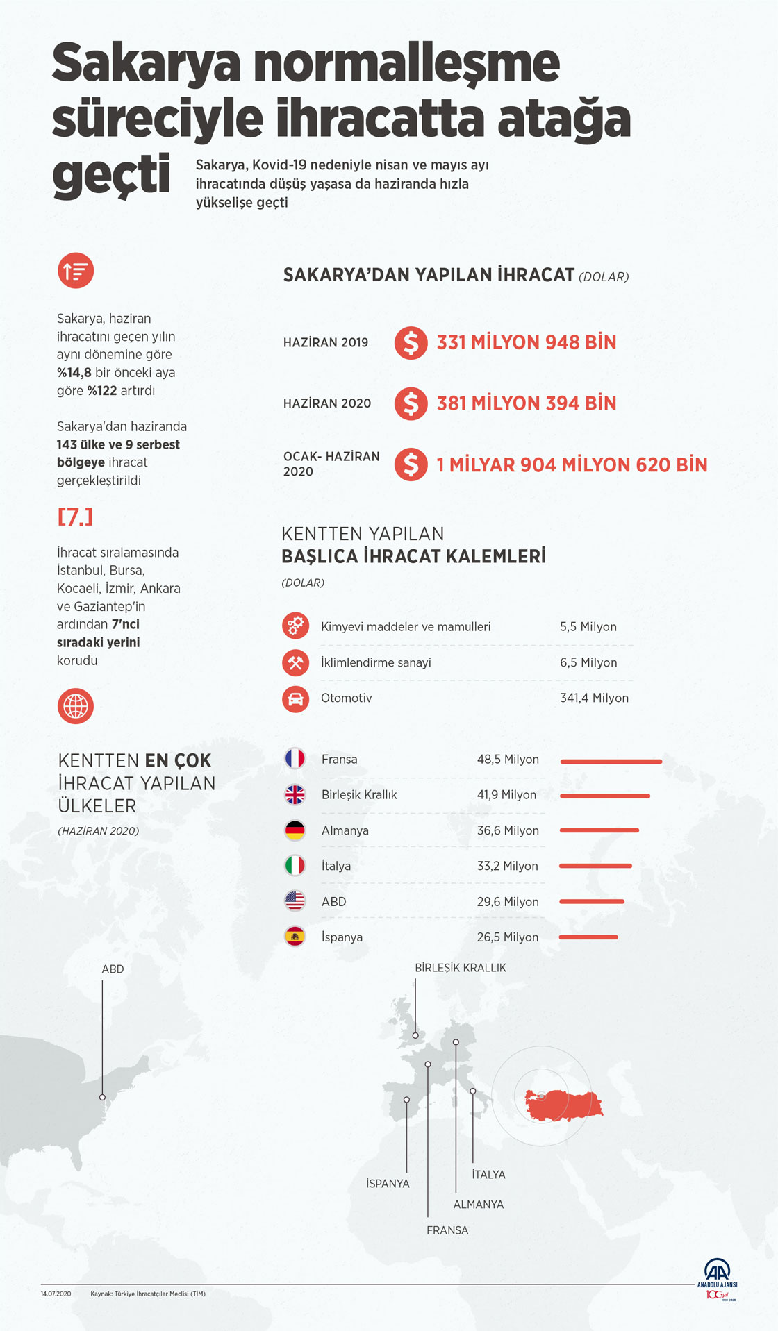 Sakarya, yılın ilk yarısında 1 milyar 904 milyon 620 bin dolarlık dış satım yaparak ihracat sıralamasında İstanbul, Bursa, Kocaeli, İzmir, Ankara ve Gaziantep'in ardından 7'nci sıradaki yerini korudu. Sakarya'dan yılın altıncı ayında en fazla ihracat yapılan ülke, 48 milyon 504 bin dolarla Fransa oldu.