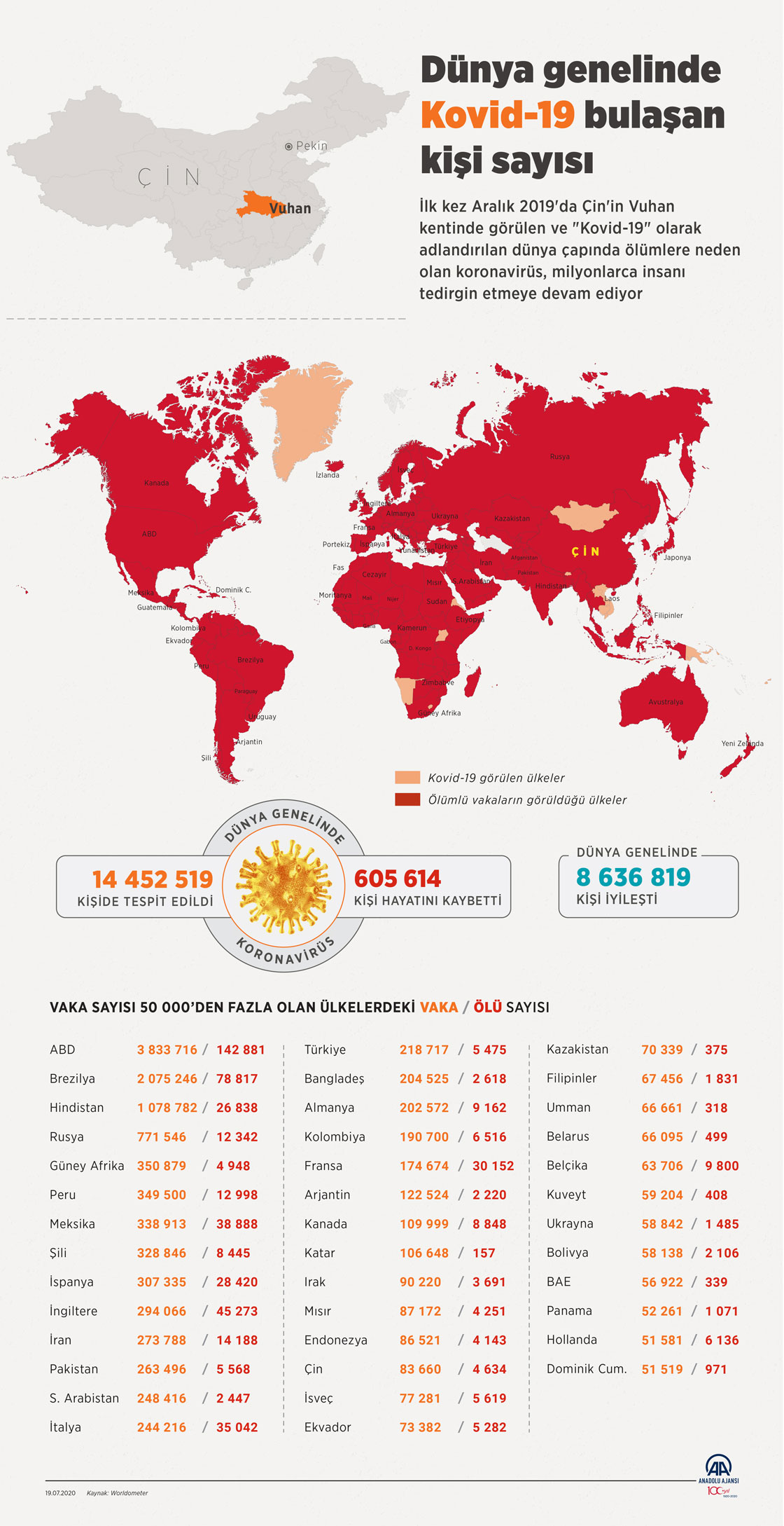Çin'in Hubey eyaletine bağlı Vuhan kentinde ortaya çıkan yeni tip koronavirüsün (Kovid-19) dünya genelinde bulaştığı kişi sayısı 14 milyon 443 bini aştı ( Mahmut Resul Karaca - Anadolu Ajansı )