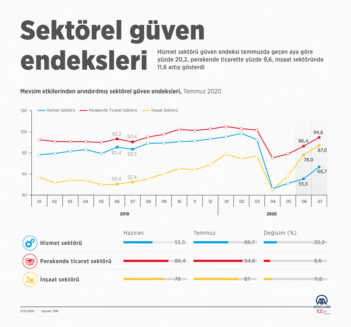 Hizmet sektörü güven endeksi temmuzda geçen aya göre yüzde 20,2, perakende ticarette yüzde 9,6, inşaat sektöründe 11,6 artış gösterdi. ( Yasin Demirci - Anadolu Ajansı )