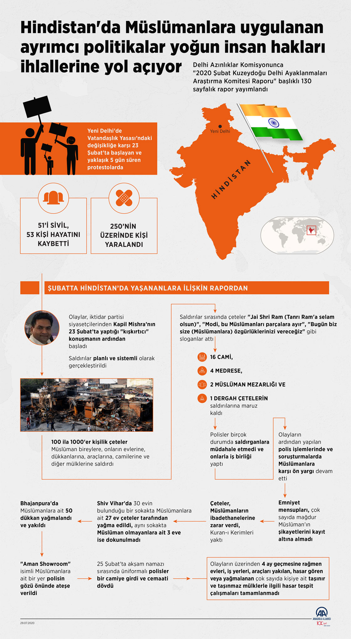 Hindistan'ın başkenti Yeni Delhi’de çoğunluğu Müslüman 51’i sivil 53 kişinin hayatını kaybettiği şubat ayındaki şiddet olaylarıyla ilgili devlete bağlı Delhi Azınlıklar Komisyonunca hazırlanan raporda Müslümanlara uygulanan ayrımcı politikaların yoğun insan hakları ihlallerine yol açtığı bildirildi. ( Yasin Demirci - Anadolu Ajansı )29 Temmuz 2020•Güncelleme: 29 Temmuz 2020