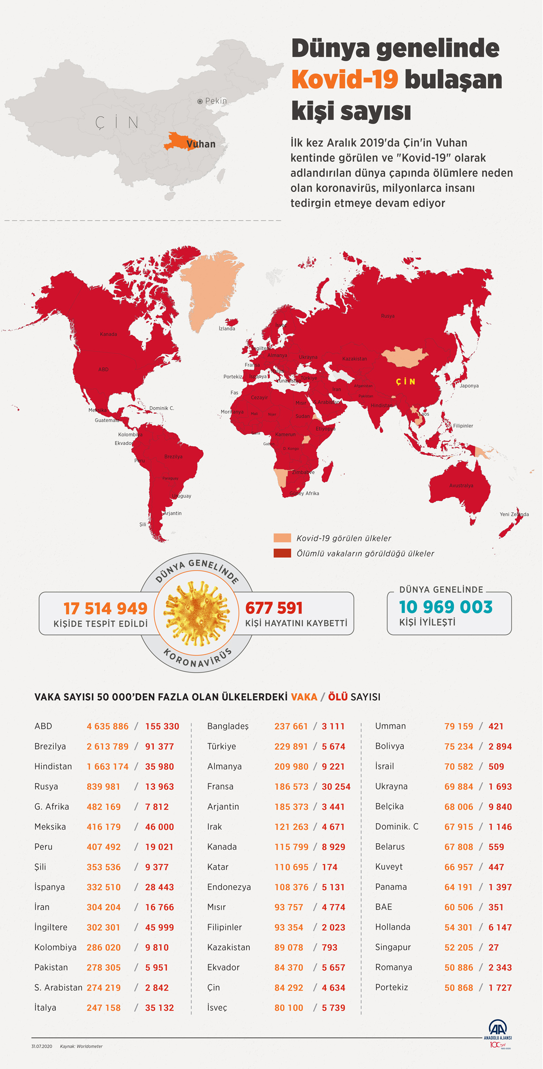 Dünya genelinde Kovid-19 tespit edilen kişi sayısı 17 milyon 496 bini geçti
