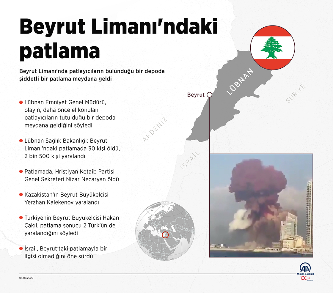 Lübnan'daki Beyrut Limanı'nda meydana gelen patlamada 30 kişinin öldüğü, 2 bin 500 kişinin de yaralandığı bildirildi.