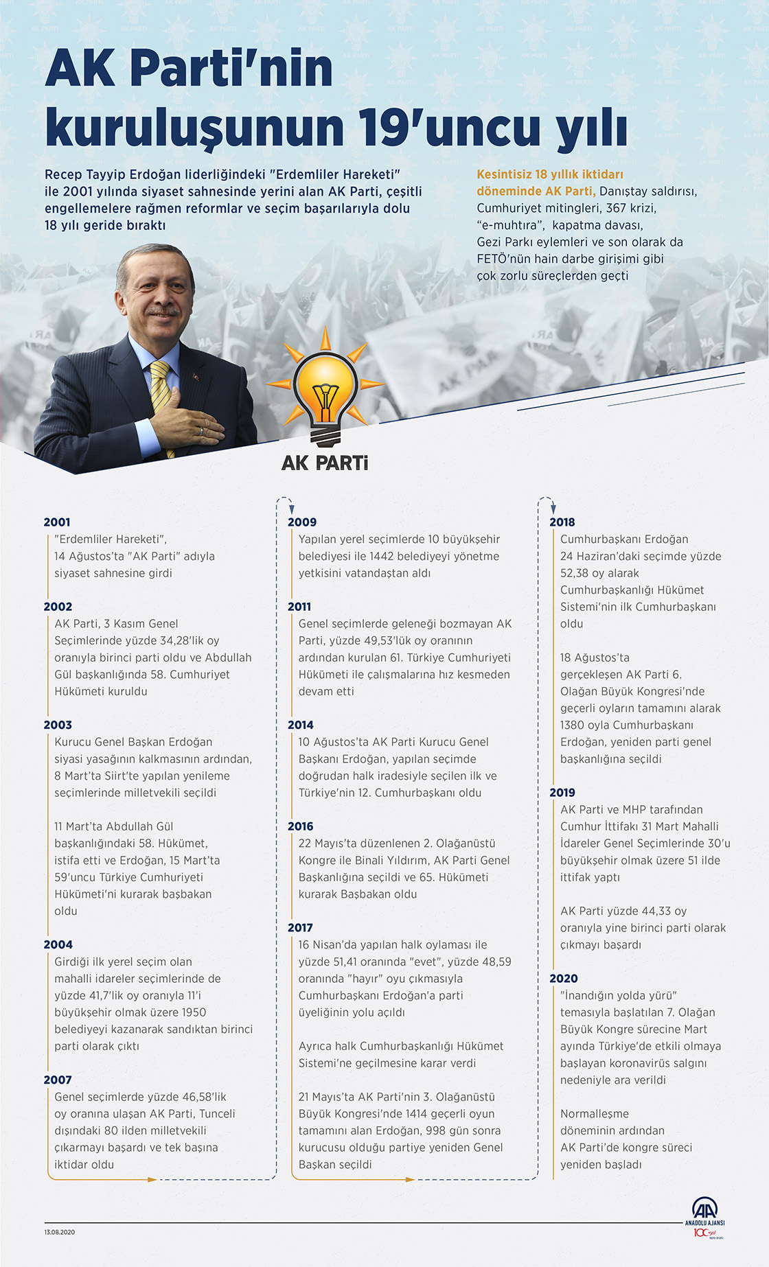 Cumhurbaşkanı ve AK Parti Genel Başkanı Recep Tayyip Erdoğan liderliğindeki "Erdemliler Hareketi" ile 2001 yılında siyaset sahnesinde yerini alan AK Parti, çeşitli engellemelere rağmen reformlar ve seçim başarılarıyla dolu 18 yılı geride bıraktı. ( Yasin Demirci - Anadolu Ajansı )13 Ağustos 2020•Güncelleme: 13 Ağustos 2020
