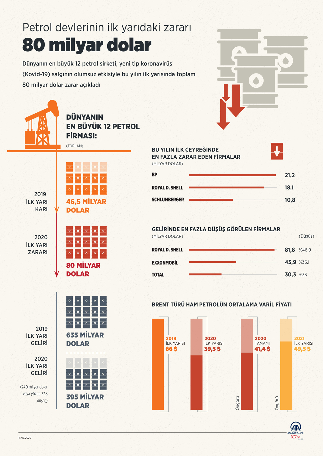 Dünyanın en büyük 12 petrol şirketi, yeni tip koronavirüs (Kovid-19) salgınının etkisiyle bu yılın ilk yarısında toplam 80 milyar dolar zarar açıkladı.