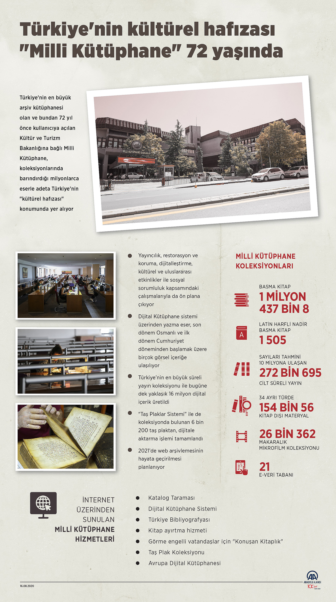 Türkiye'nin en büyük arşiv kütüphanesi olan Kültür ve Turizm Bakanlığına bağlı Milli Kütüphane, koleksiyonlarında barındırdığı milyonlarca eserle 72 yıldır Türkiye'nin "kültürel hafızası" olarak hizmet veriyor.