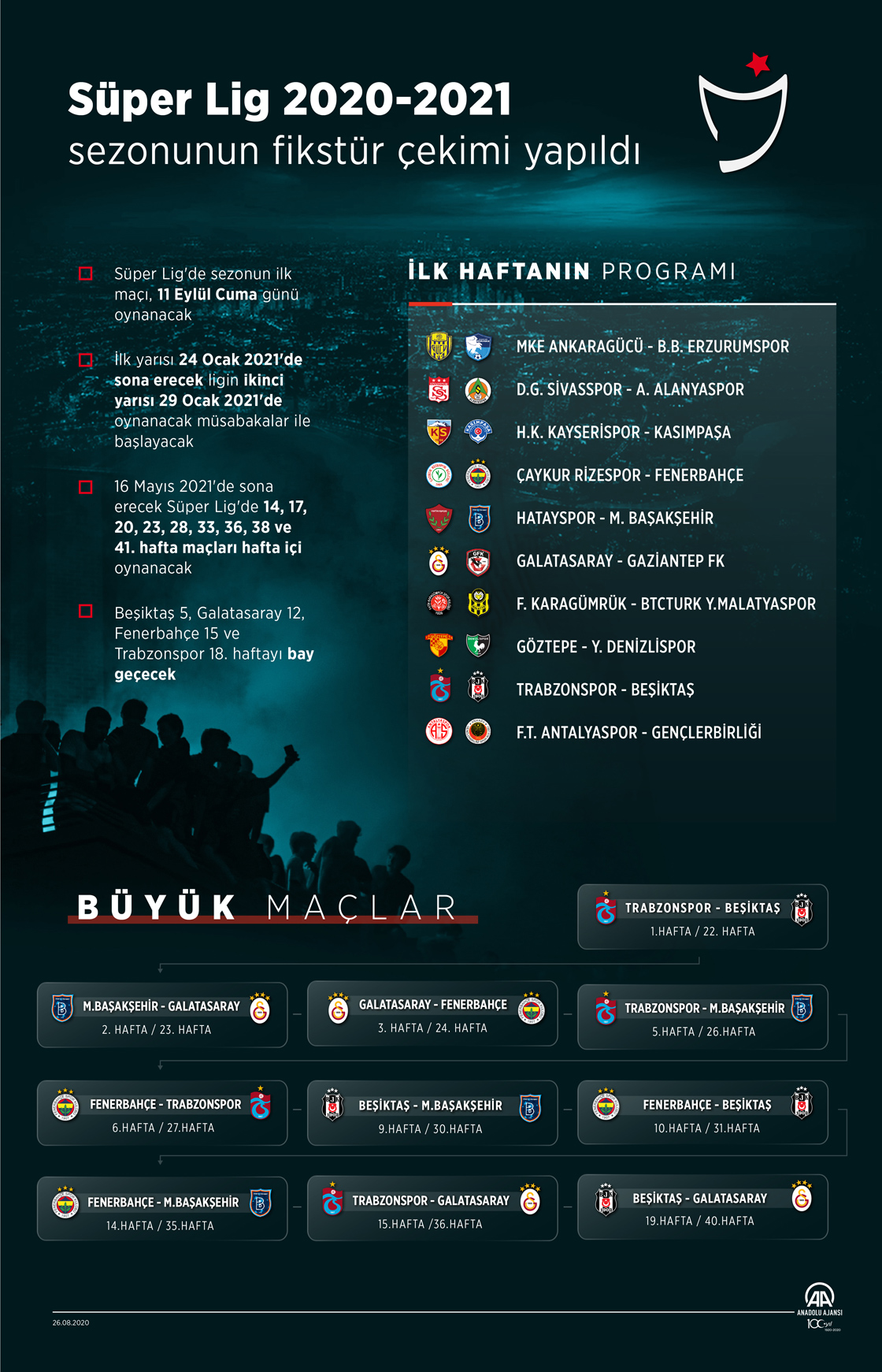 Süper Lig'de, 2020-2021 futbol sezonunun fikstürü çekildi. Süper Lig'de sezonun ilk maçı, 11 Eylül Cuma günü oynanacak. İlk yarısı 24 Ocak 2021'de sona erecek ligin ikinci yarısı 29 Ocak 2021'de oynanacak müsabakalar ile başlayacak. 16 Mayıs 2021'de sona erecek Süper Lig'de 14, 17, 20, 23, 28, 33, 36, 38 ve 41. hafta maçları hafta içi oynanacak. (Grafik: Kemal Delikmen/AA)
