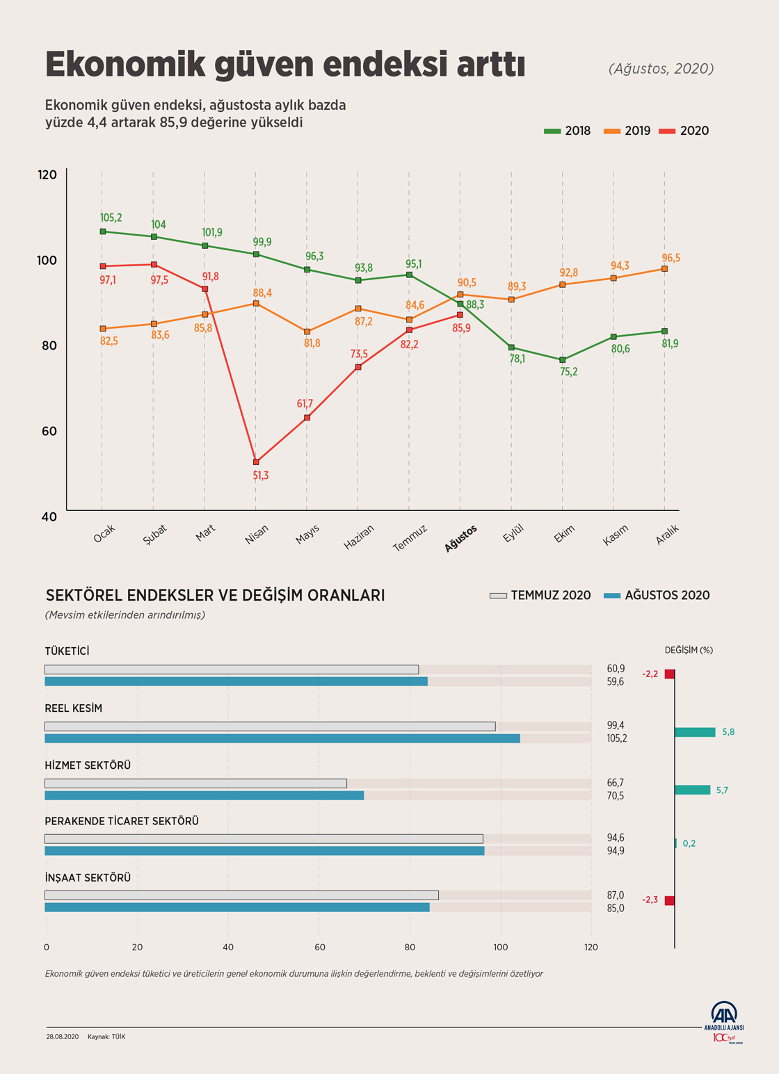 Türkiye İstatistik Kurumu, ağustos ayına ilişkin ekonomik güven endeksi verilerini açıkladı. Ekonomik güven endeksi, ağustosta aylık bazda yüzde 4,4 artarak 85,9 değerine yükseldi. ( Kemal Delikmen - Anadolu Ajansı )