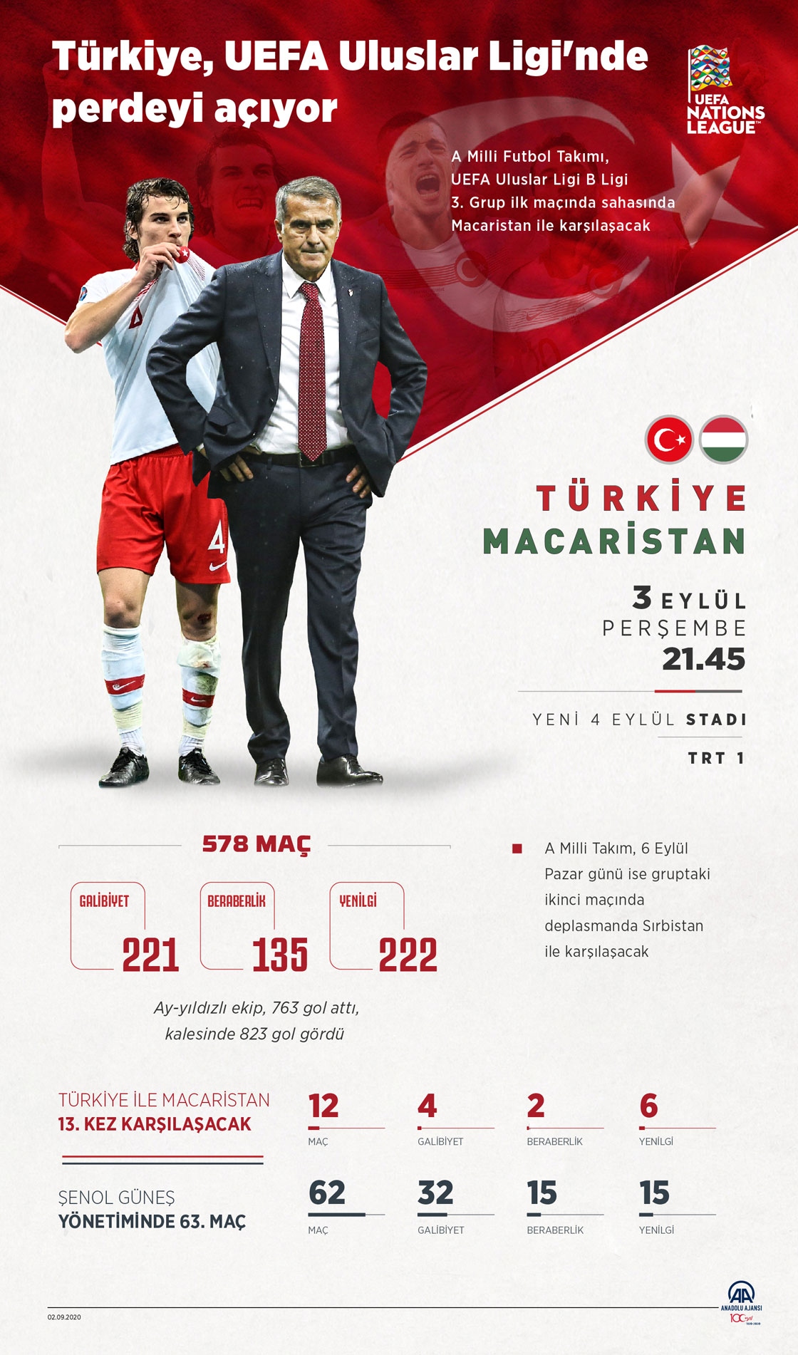 A Milli Futbol Takımı, UEFA Uluslar Ligi B Ligi 3. Grup ilk maçında 3 Eylül'de sahasında Macaristan ile karşı karşıya gelecek. Yeni 4 Eylül Stadı'nda oynanacak mücadele 21.45'te başlayacak ve TRT 1'den naklen yayımlanacak.