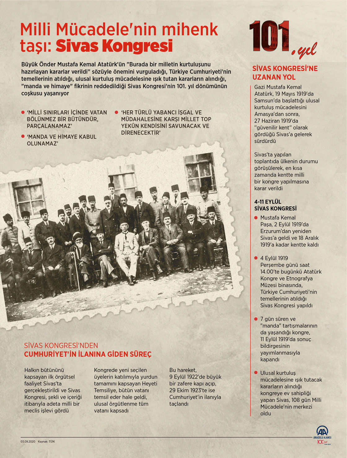 Büyük Önder Mustafa Kemal Atatürk'ün "Burada bir milletin kurtuluşunu hazırlayan kararlar verildi" sözüyle önemini vurguladığı, Türkiye Cumhuriyeti'nin temellerinin atıldığı, ulusal kurtuluş mücadelesine ışık tutan kararların alındığı, "manda ve himaye" fikrinin reddedildiği Sivas Kongresi'nin 101. yıl dönümünün coşkusu yaşanıyor. ( Ahmet Burak Özkan - Anadolu Ajansı )03 Eylül 2020•Güncelleme: 03 Eylül 2020