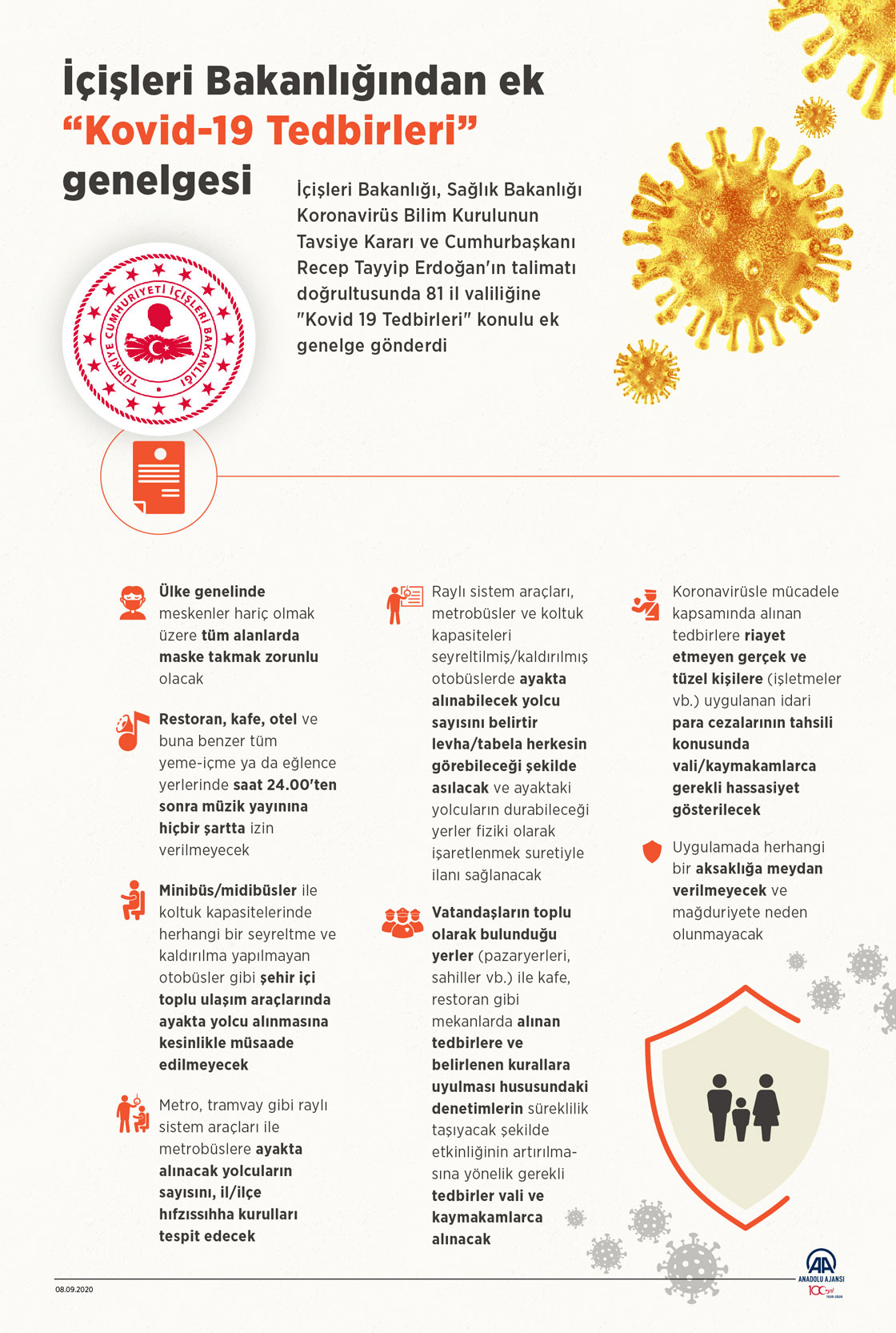 İçişleri Bakanlığı, Sağlık Bakanlığı Koronavirüs Bilim Kurulunun Tavsiye Kararı ve Cumhurbaşkanı Recep Tayyip Erdoğan'ın talimatı doğrultusunda 81 il valiliğine "Kovid 19 Tedbirleri" konulu ek genelge gönderdi. ( Elmurod Usubaliev - Anadolu Ajansı )08 Eylül 2020•Güncelleme: 08 Eylül 2020
