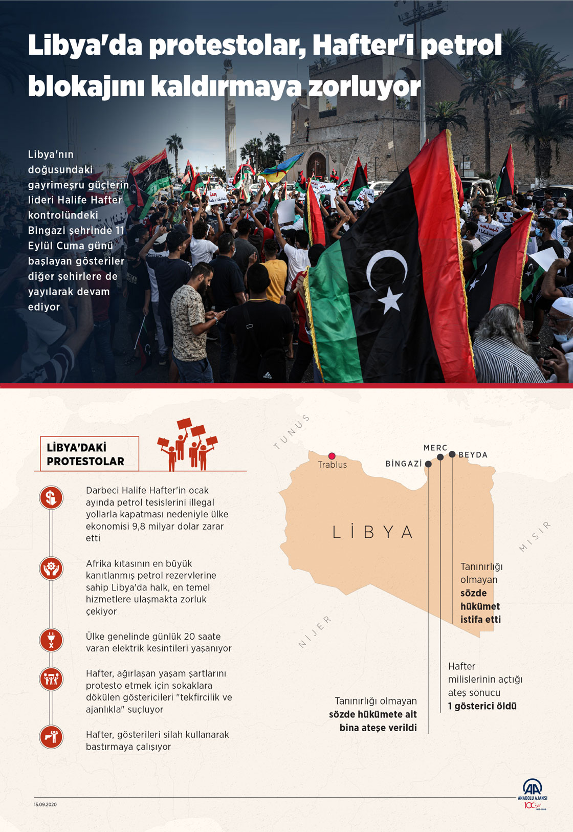 Libya'da kamu hizmetlerindeki kesintiler ve ağırlaşan yaşam şartları nedeniyle ülkenin doğusundaki gayrimeşru güçlerin lideri Halife Hafter kontrolündeki Bingazi şehrinde cuma günü başlayan gösteriler diğer şehirlere de yayılarak devam etti. ( Kemal Delikmen - Anadolu Ajansı )15 Eylül 2020•Güncelleme: 15 Eylül 2020