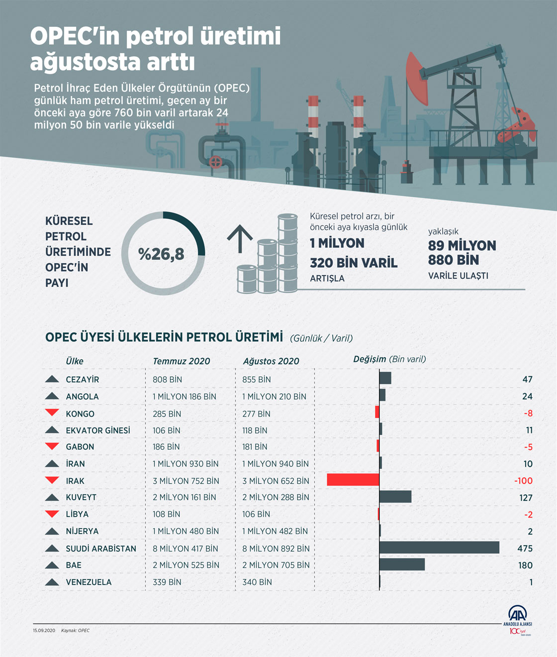 Petrol İhraç Eden Ülkeler Örgütünün (OPEC) günlük ham petrol üretimi, geçen ay bir önceki aya göre 760 bin varil artarak 24 milyon 50 bin varile yükseldi. Ağustosta küresel petrol arzı önceki aya göre günlük 1 milyon 320 bin varil artarak 89 milyon 880 bin varil oldu. ( Ahmet Burak Özkan - Anadolu Ajansı )15 Eylül 2020•Güncelleme: 15 Eylül 2020
