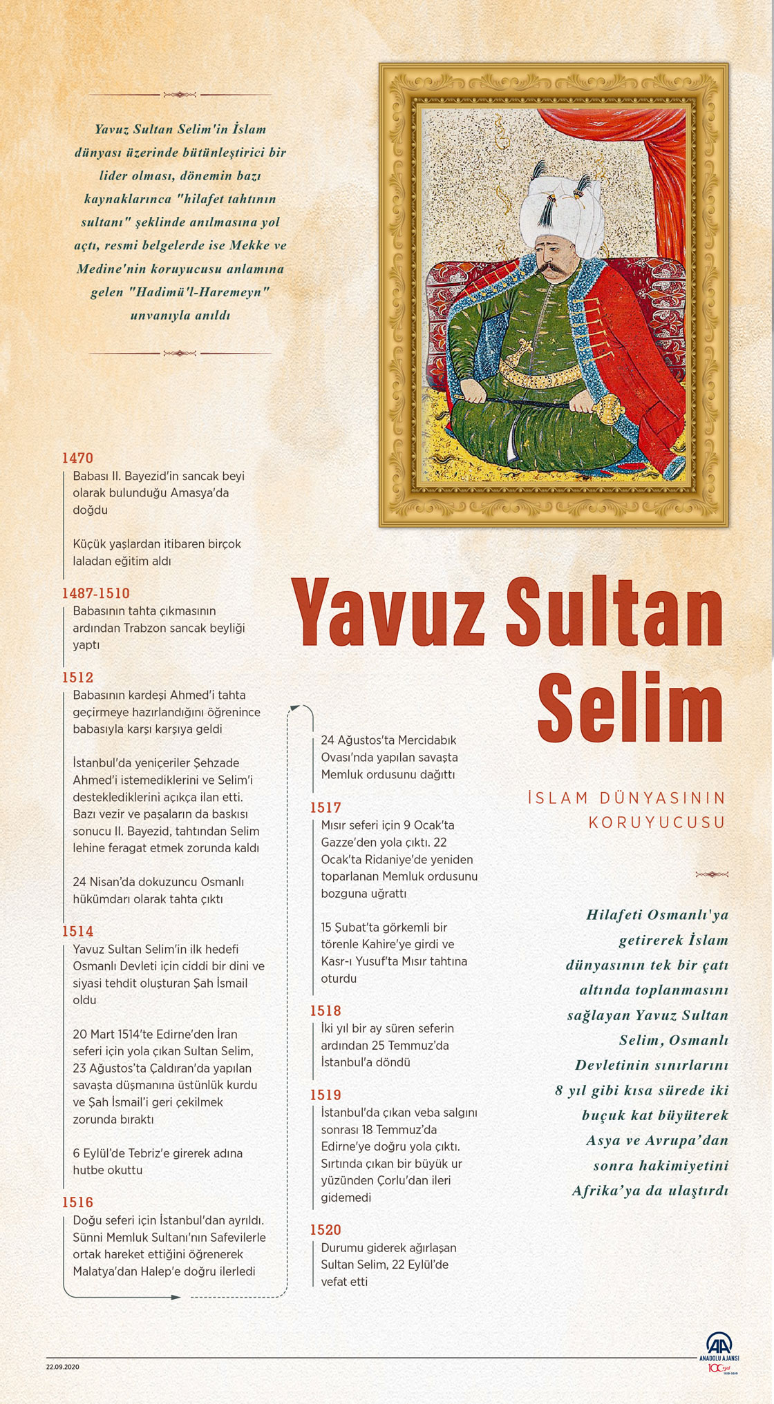 Yavuz Sultan Selim'in İslam dünyası üzerinde bütünleştirici bir lider olması, dönemin bazı kaynaklarınca "hilafet tahtının sultanı" şeklinde anılmasına yol açtı, resmi belgelerde ise Mekke ve Medine'nin koruyucusu anlamına gelen "Hadimü'l-Haremeyn" unvanıyla anıldı. ( Kemal Delikmen - Anadolu Ajansı )22 Eylül 2020•Güncelleme: 22 Eylül 2020