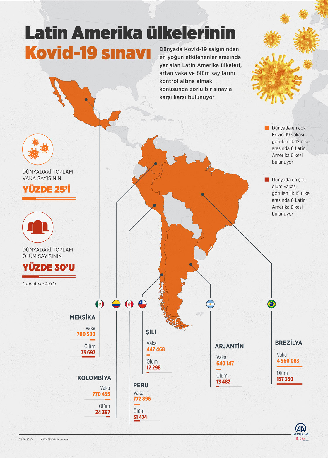 Dünyada Kovid-19 salgınından en yoğun etkilenenler arasında yer alan Latin Amerika ülkeleri, artan vaka ve ölüm sayılarını kontrol altına almak konusunda zorlu bir sınavla karşı karşı bulunuyor. ( Grafik: Muhammed Ali Yiğit - Anadolu Ajansı )