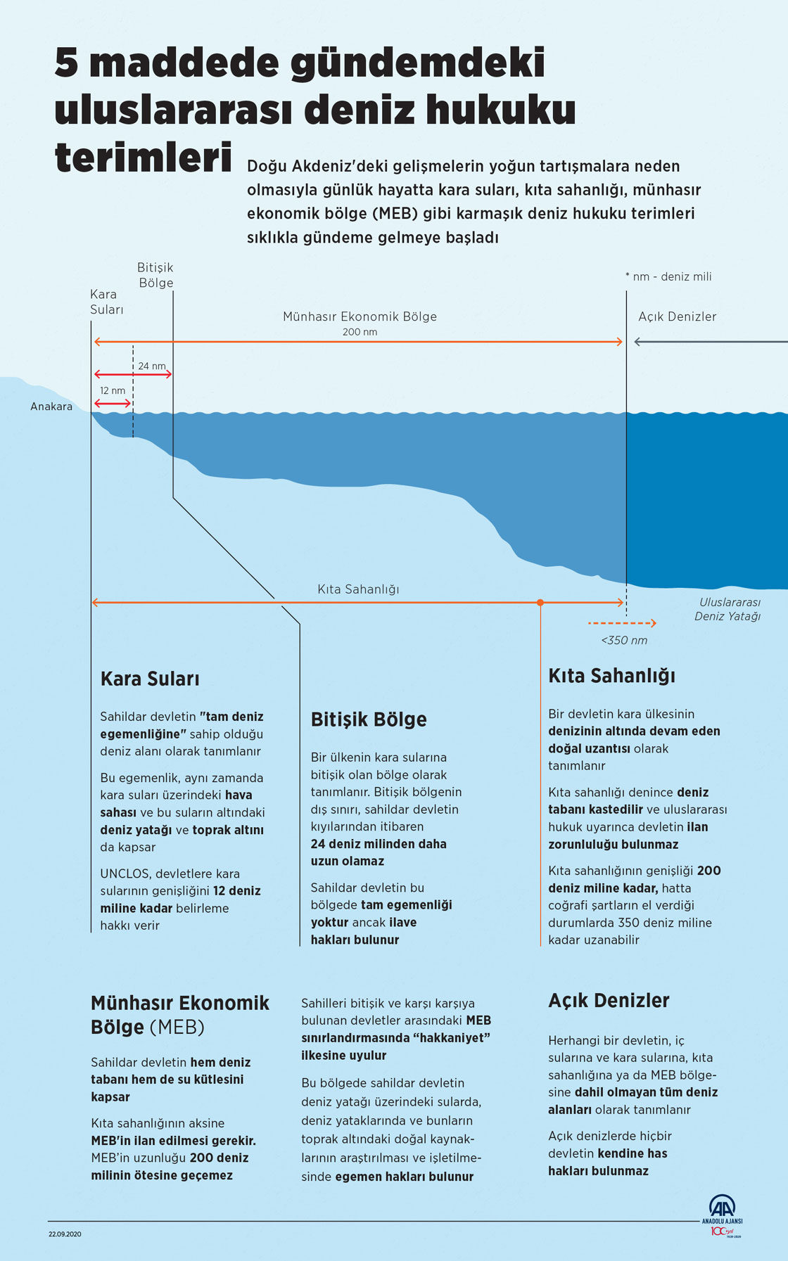Doğu Akdeniz'deki gelişmelerin yoğun tartışmalara neden olmasıyla günlük hayatta kara suları, kıta sahanlığı, münhasır ekonomik bölge (MEB) gibi karmaşık deniz hukuku terimleri sıklıkla gündeme gelmeye başladı. ( Elmurod Usubaliev - Anadolu Ajansı )22 Eylül 2020•Güncelleme: 22 Eylül 2020