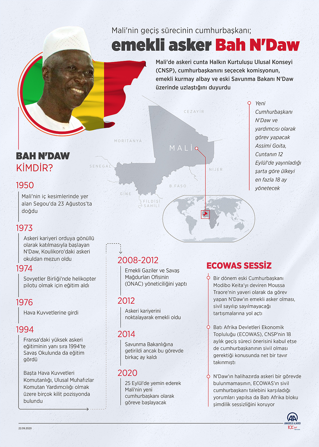 Mali'de askeri cunta Halkın Kurtuluşu Ulusal Konseyi (CNSP), cumhurbaşkanını seçecek komisyonun, emekli kurmay albay ve eski Savunma Bakanı N'Daw üzerinde uzlaştığını duyurdu.