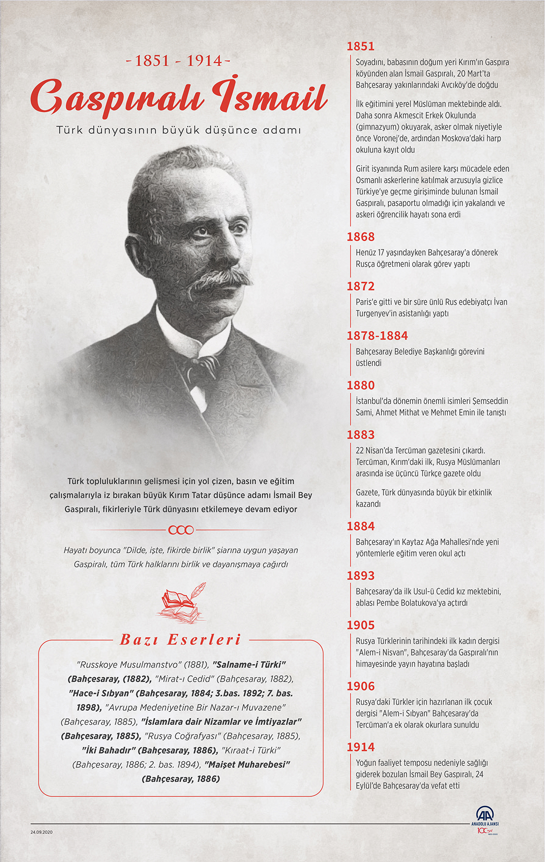 Türk topluluklarının gelişmesi için yol çizen, basın ve eğitim çalışmalarıyla iz bırakan büyük Kırım Tatar düşünce adamı İsmail Bey Gaspıralı, fikirleriyle Türk dünyasını etkilemeye devam ediyor.