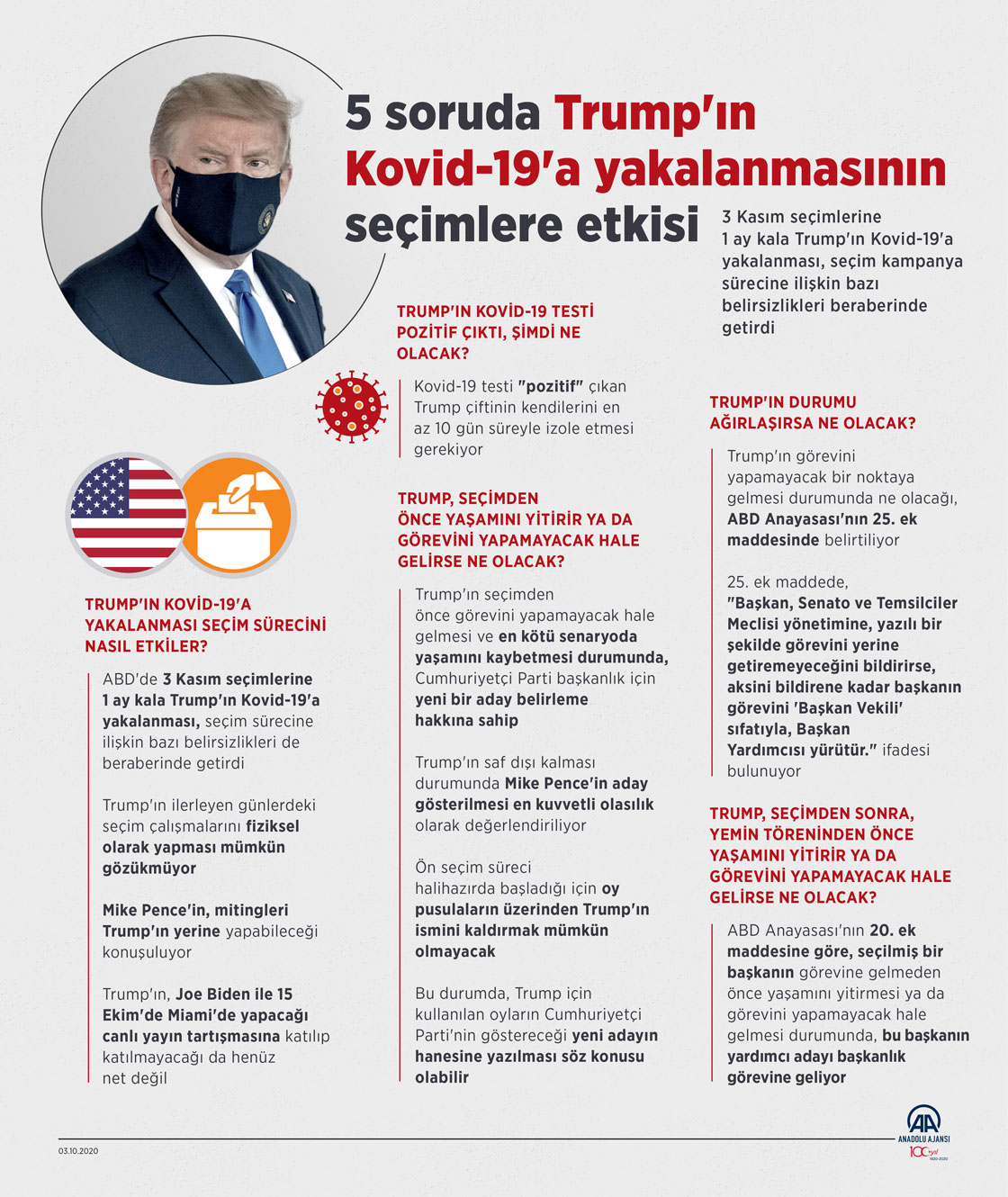 ABD Başkanı Donald Trump ve eşi Melania Trump'ın yeni tip koronavirüse (Kovid-19) yakalanmasının ardından, ABD yönetiminde bundan sonraki sürecin nasıl işleyeceği, hastalığın seçim sürecine etkisinin ne olacağı ve Trump'ın durumunun ağırlaşması durumunda neler yaşanabileceği soruları gündeme oturdu. ( Yasin Demirci - Anadolu Ajansı )03 Ekim 2020•Güncelleme: 03 Ekim 2020