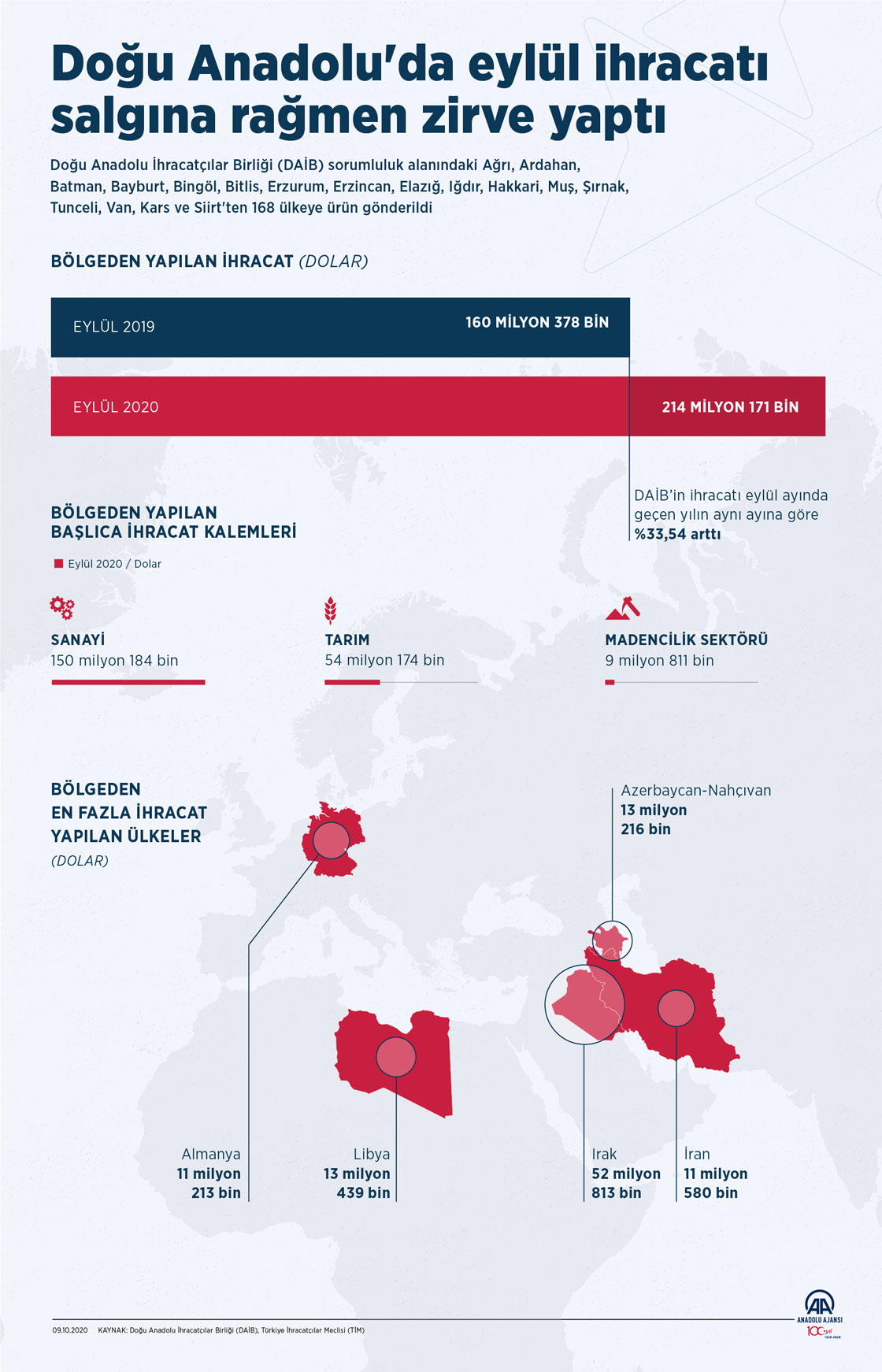 Doğu Anadolu İhracatçılar Birliği (DAİB) kanalıyla eylül ayında yapılan ihracat, yeni tip koronavirüs (Kovid-19) salgınına rağmen geçen yılın aynı dönemine göre yüzde 33,54 artışla Türkiye'nin ihracat ortalamasının da üzerine çıkarak 214 milyon 171 bin dolar oldu. ( Ahmet Burak Özkan - Anadolu Ajansı )09 Ekim 2020•Güncelleme: 09 Ekim 2020