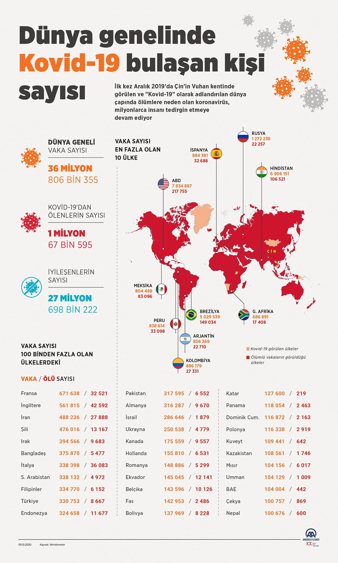Çin'in Hubey eyaletine bağlı Vuhan kentinde ortaya çıkan ve dünya geneline yayılan yeni tip koronavirüs (Kovid-19) salgınında toplam vaka sayısı 36 milyon 754 bini geçti.