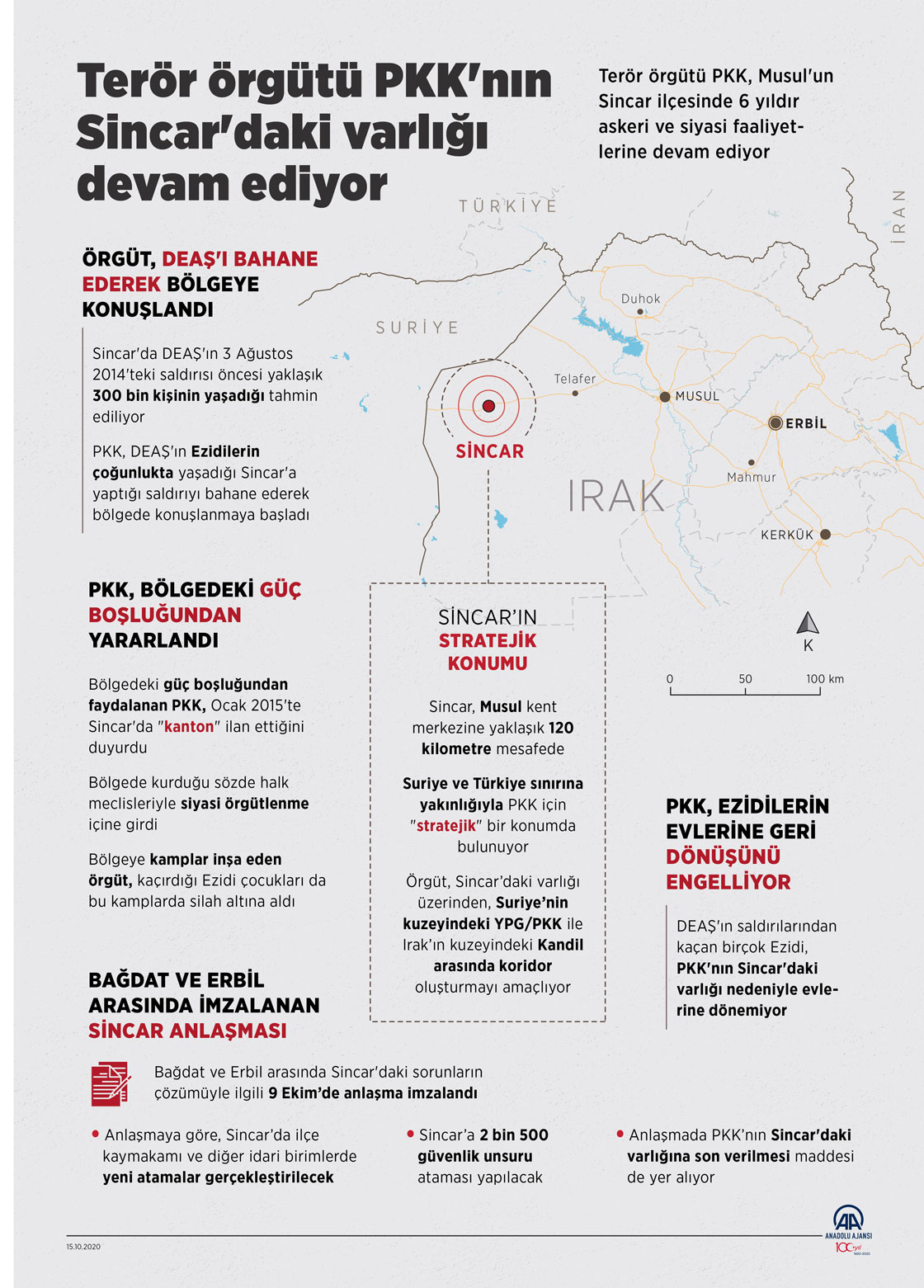 Terör örgütü PKK, Suriye ve Kandil'den getirdiği militanlar ve kendisine bağlı yerel milislerle konuşlandığı Musul'un Sincar ilçesinde, 6 yıldır askeri ve siyasi faaliyetlerine devam ediyor. ( Elmurod Usubaliev - Anadolu Ajansı )