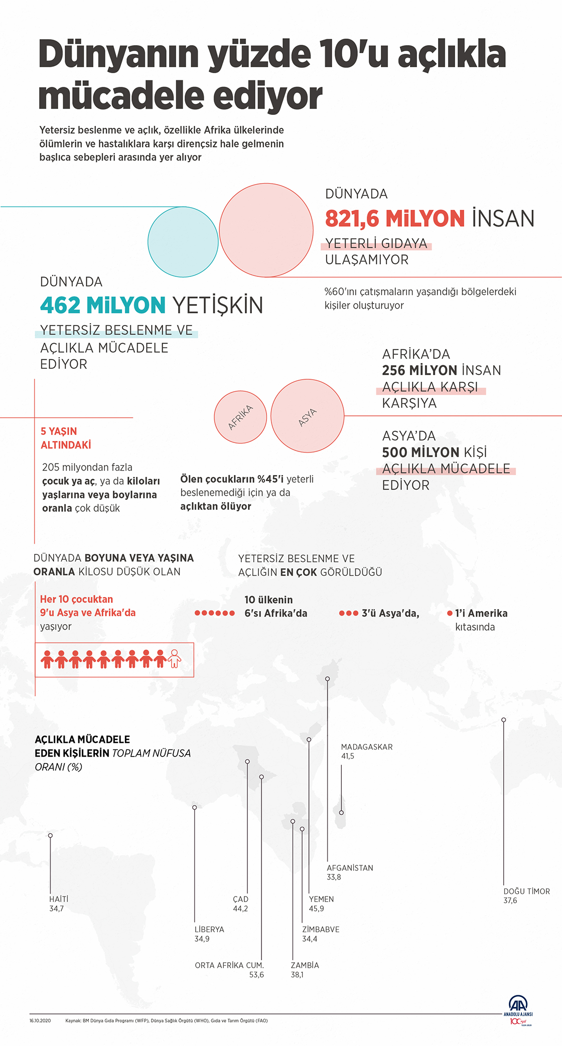 Dünya nüfusunun yaklaşık yüzde 10'unu oluşturan 821,6 milyon insan dünyada yeterli gıdaya ulaşamazken, bu sayının yüzde 60'ını siyasi istikrarın olmadığı, savaşların ve iç çatışmaların yaşandığı bölgelerdeki kişiler oluşturuyor.