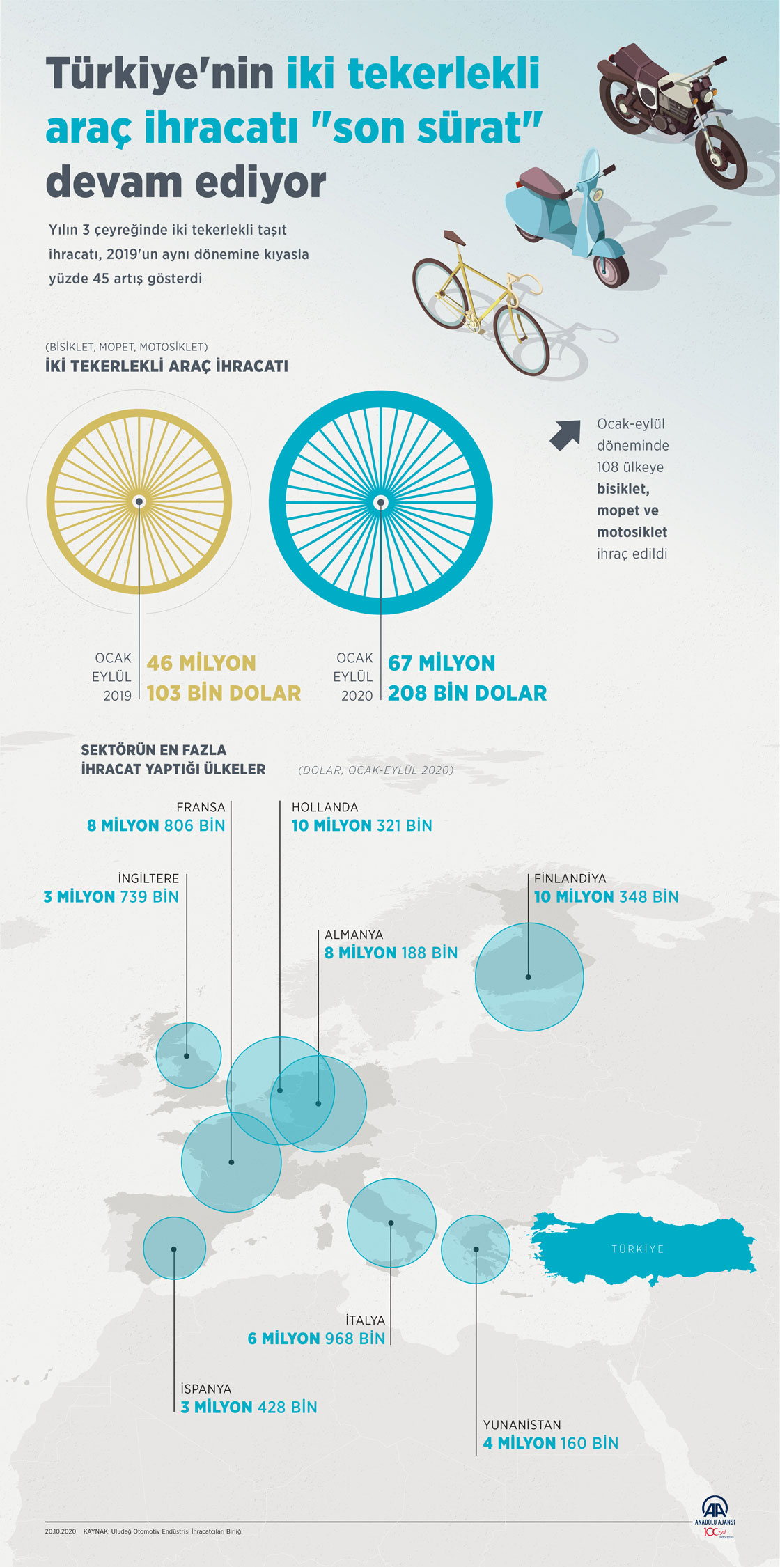Türkiye'den ocak-eylül döneminde 67 milyon 208 bin dolarlık bisiklet, mopet (motorlu bisiklet) ve motosiklet ihracatı gerçekleştirildi. Yılın 3 çeyreğinde iki tekerlekli taşıt dış satımı 2019'un aynı dönemine göre yüzde 45 arttı.