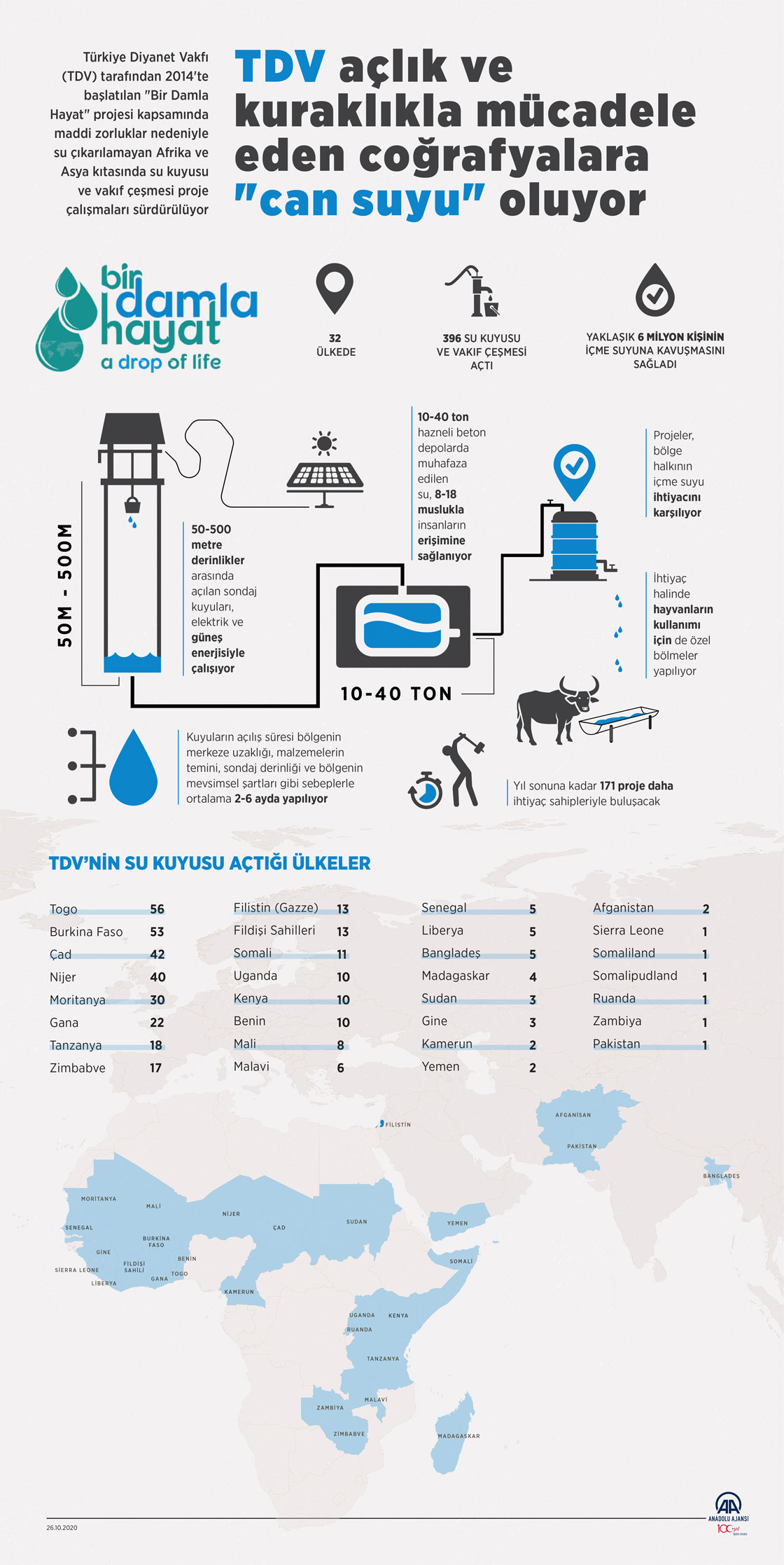 Türkiye Diyanet Vakfı (TDV) tarafından 2014'te başlatılan "Bir Damla Hayat" projesi kapsamında maddi zorluklar nedeniyle su çıkarılamayan Afrika ve Asya kıtasında su kuyusu ve vakıf çeşmesi proje çalışmaları sürdürülüyor. ( Mahmut Resul Karaca - Anadolu Ajansı )26 Ekim 2020•Güncelleme: 26 Ekim 2020
