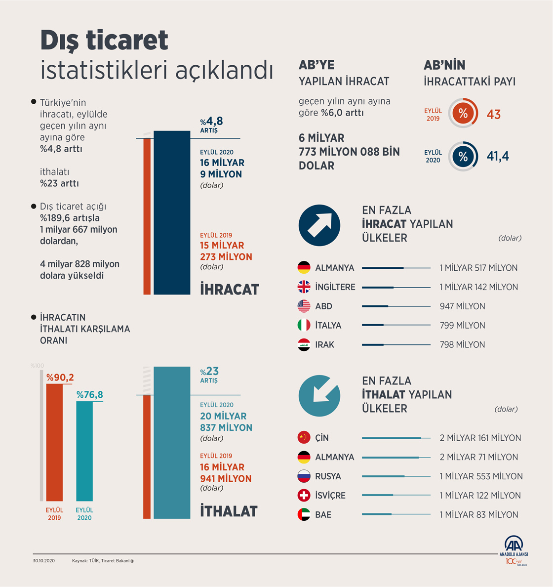 Türkiye İstatistik Kurumu ile Ticaret Bakanlığı iş birliğiyle oluşturulan eylül ayına ilişkin geçici dış ticaret verileri açıklandı. Türkiye'nin eylül ihracatında imalat sanayisinin payı yüzde 94,8'i bulurken, ithalatta ara mallarının payı yüzde 74,9 olarak kayıtlara geçti. (Grafik: Yasin Demirci/AA)30 Ekim 2020•Güncelleme: 30 Ekim 2020