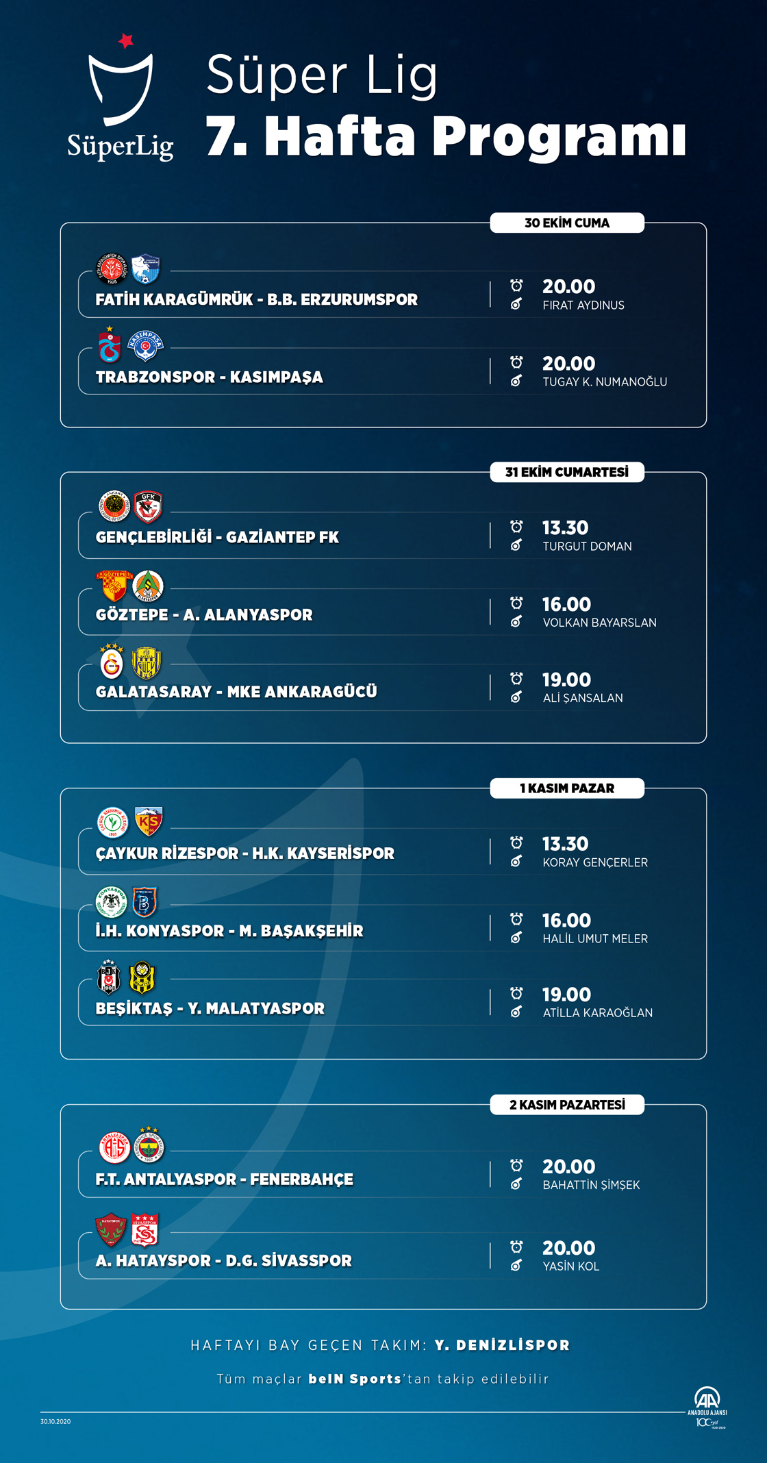 Süper Lig'in 7. haftasında 30 Ekim Cuma günü 2 maç ile başlayacak. 31 Ekim Cumartesi ve 1 Kasım Pazar günü 3 ve 2 Kasım Pazartesi ise 2 maç oynanacak.(Grafik: Yasin Demirci/AA)