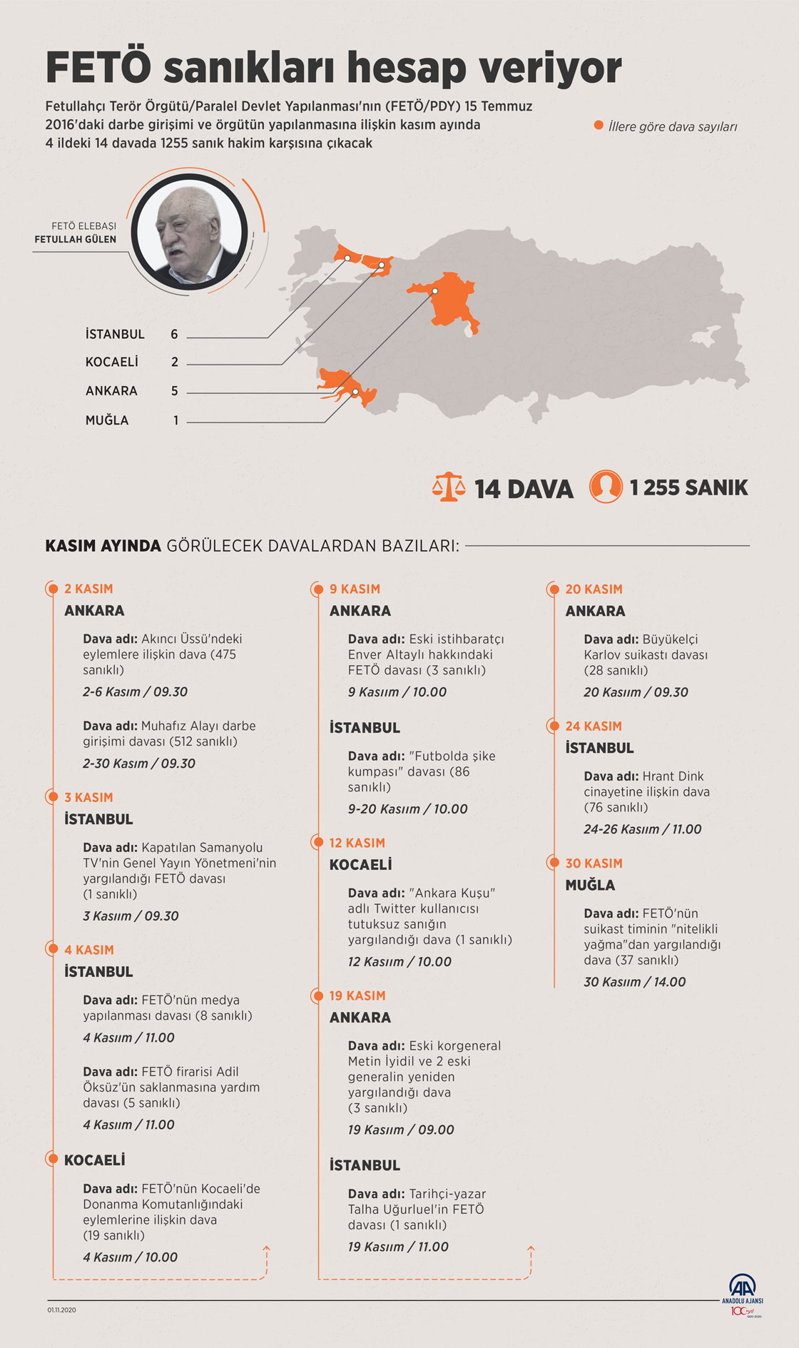 Fetullahçı Terör Örgütü/Paralel Devlet Yapılanması'nın (FETÖ/PDY) 15 Temmuz 2016'daki darbe girişimi ve örgütün yapılanmasına ilişkin kasım ayında 4 ildeki 14 davada 1255 sanık hakim karşısına çıkacak