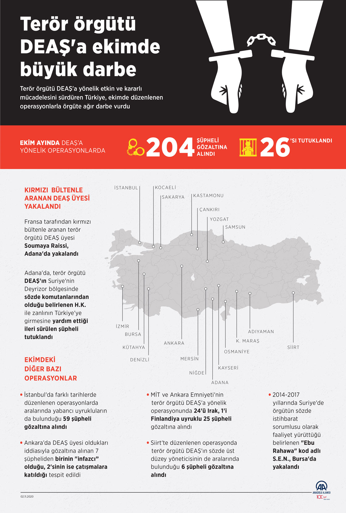 Terör örgütü DEAŞ'a karşı etkin ve kararlı mücadelesini sürdüren Türkiye, geçen ay yurt genelindeki operasyonlarla örgüte büyük darbe vurdu, teröristlerin planladığı eylemler güvenlik güçlerinin başarılı çalışmalarıyla engellendi. ( Mahmut Resul Karaca - Anadolu Ajansı )02 Kasım 2020•Güncelleme: 02 Kasım 2020