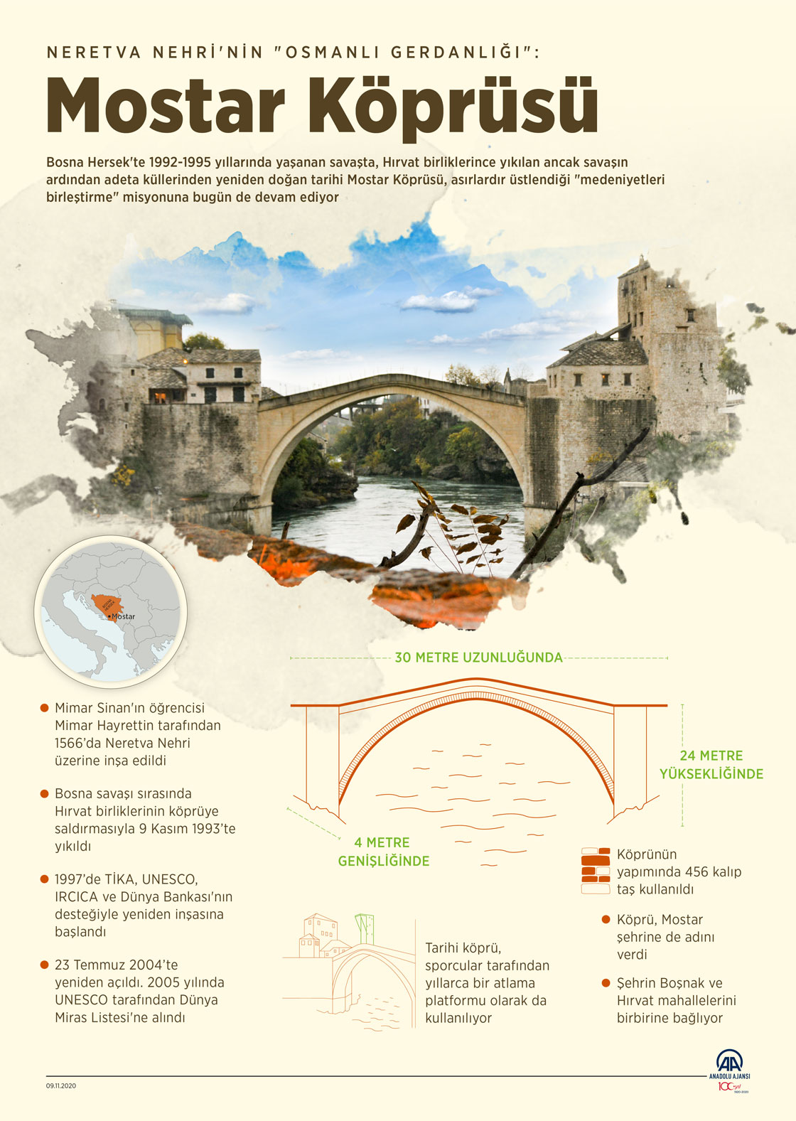 Bosna Hersek'te 1992-1995 yıllarında yaşanan savaşta, Hırvat birliklerince yıkılan ancak savaşın ardından adeta küllerinden yeniden doğan tarihi Mostar Köprüsü, asırlardır üstlendiği "medeniyetleri birleştirme" misyonuna bugün de devam ediyor. ( Yasin Demirci - Anadolu Ajansı )09 Kasım 2020•Güncelleme: 09 Kasım 2020