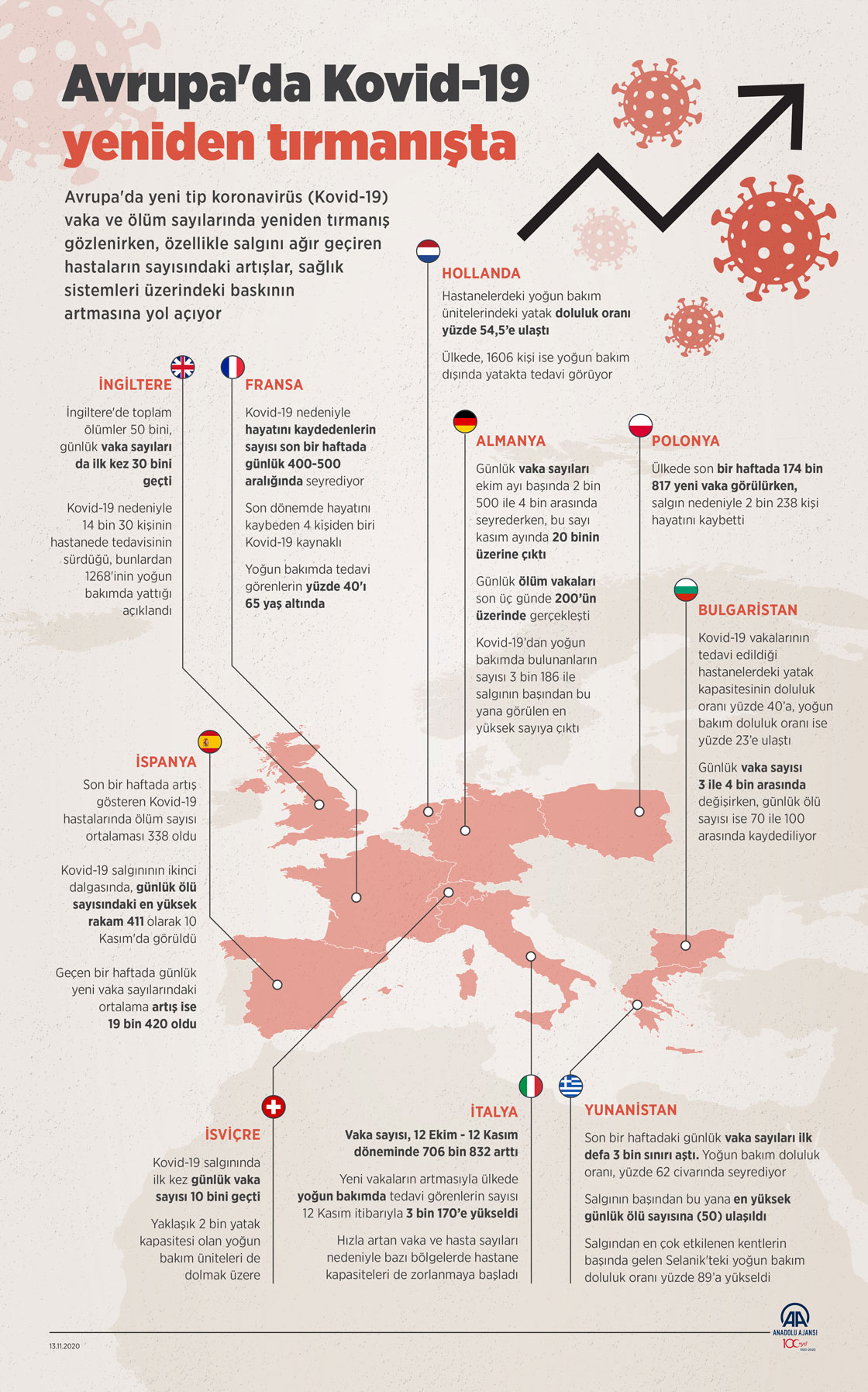 Avrupa'da yeni tip koronavirüs (Kovid-19) vaka ve ölüm sayılarında yeniden tırmanış gözlenirken, özellikle salgını ağır geçiren hastaların sayısındaki artışlar, sağlık sistemleri üzerindeki baskının artmasına yol açıyor. ( Elmurod Usubaliev - Anadolu Ajansı )13 Kasım 2020•Güncelleme: 13 Kasım 2020